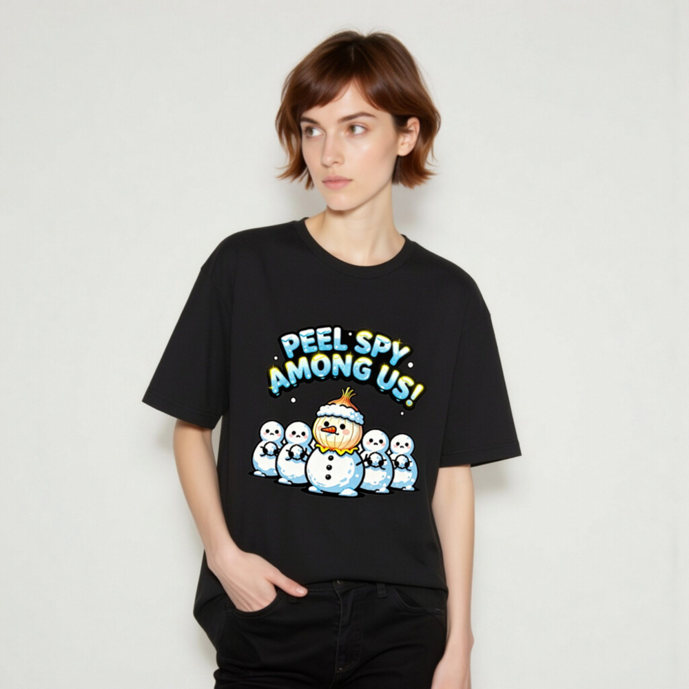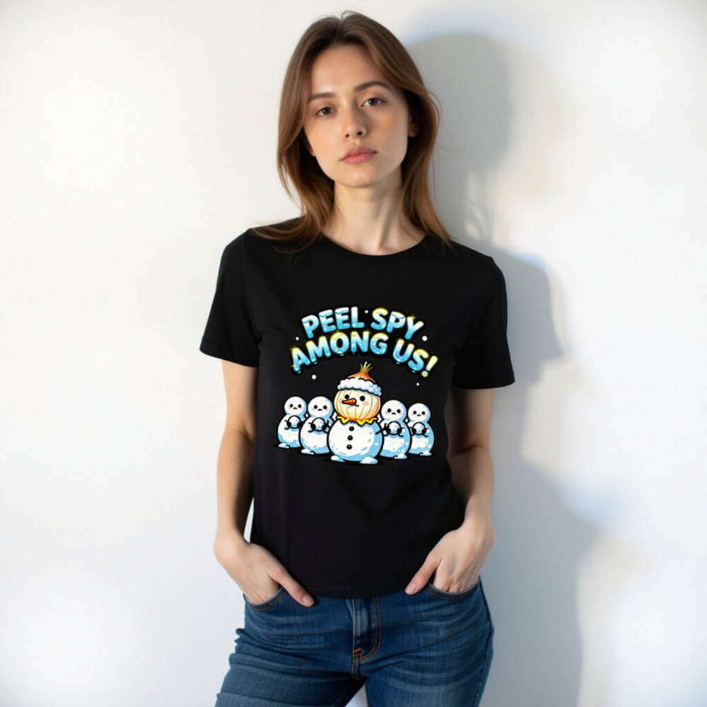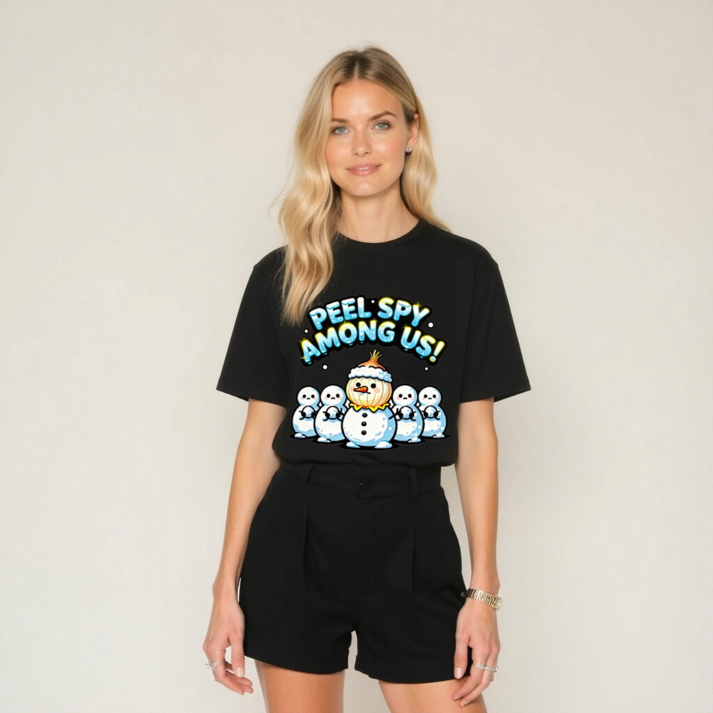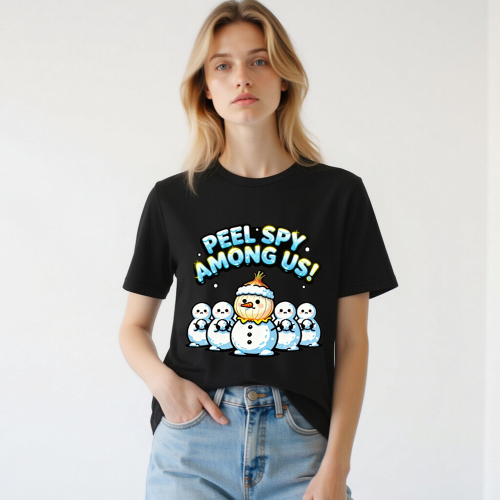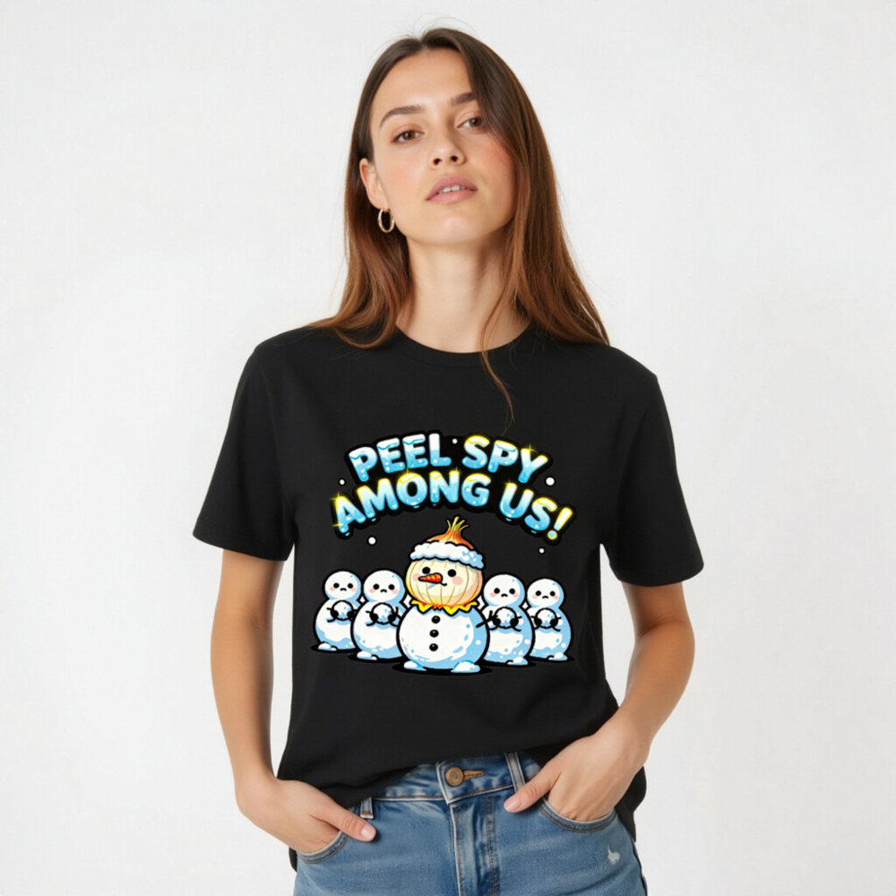 Cute ‘Peel Spy Among Us!’ snowman design with onion-headed spy among five plain snowmen—funny holiday twist on the popular game. Unisex staple t-shirt, soft cotton blend, great for Christmas, winter, or geeky fans. Perfect gift for gamers & foodies. Available in all sizes.