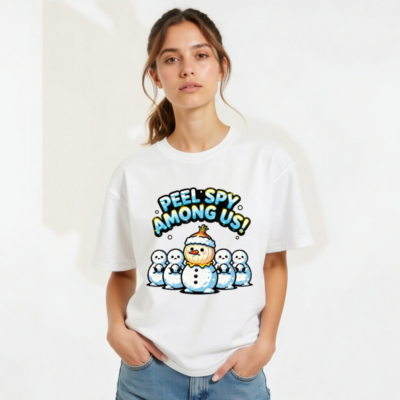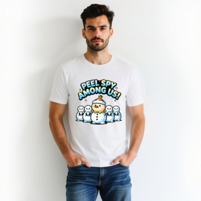 A playful unisex staple t-shirt featuring the ‘Peel Spy Among Us!’ design: a cheerful onion snowman with a snowy hat, surrounded by four classic snowmen. Perfect for winter fans and Among Us enthusiasts. Soft cotton blend, comfortable fit, versatile for casual wear. Ideal gift for holiday season or game lovers. Available in all sizes.