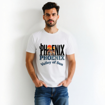 Wear the spirit of Phoenix with this unisex organic cotton t-shirt featuring a vibrant ‘Valley of Sun’ design: cactus-shaped letters, a sunset over mountains, and a golf cart. Soft, breathable, and ethically made for comfort and style. Perfect for desert lovers and local pride. Machine washable, sustainable fabric, true to size.