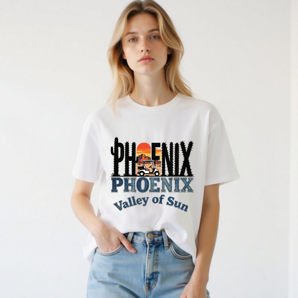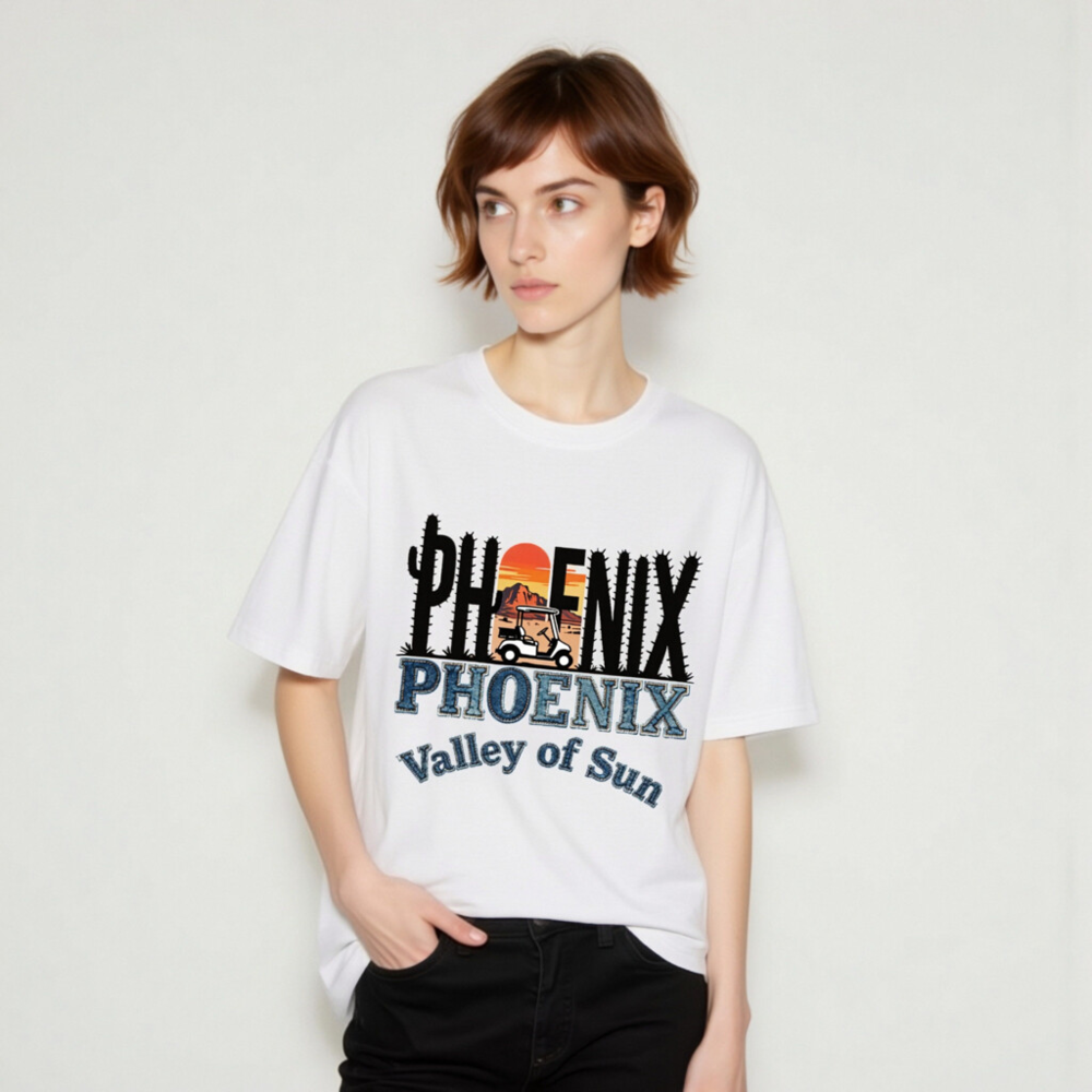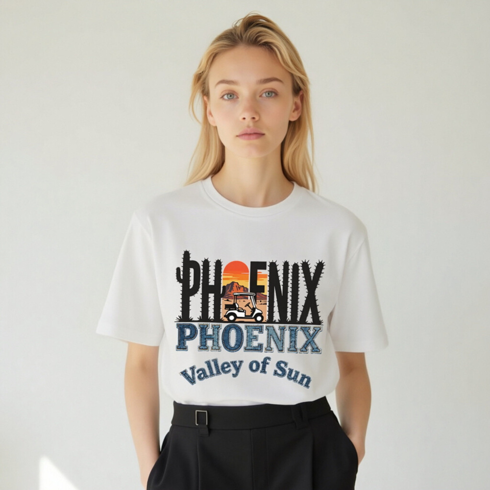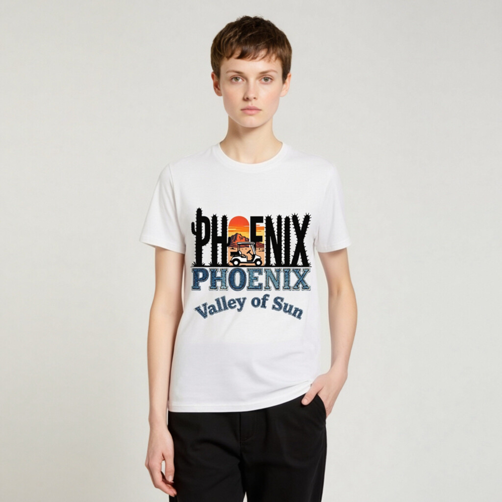 Wear the spirit of Phoenix with this unisex organic cotton t-shirt featuring a vibrant ‘Valley of Sun’ design: cactus-shaped letters, a sunset over mountains, and a golf cart. Soft, breathable, and ethically made for comfort and style. Perfect for desert lovers and local pride. Machine washable, sustainable fabric, true to size.