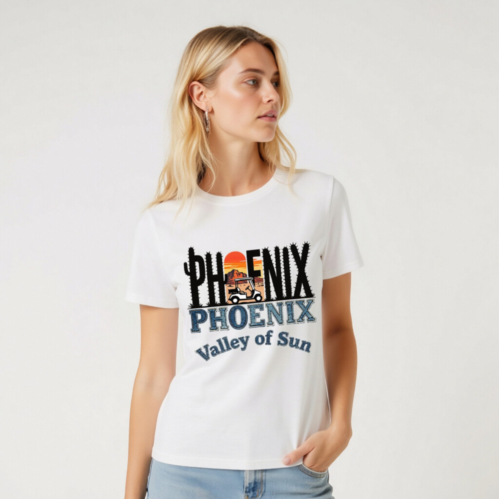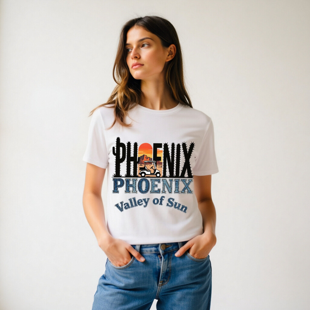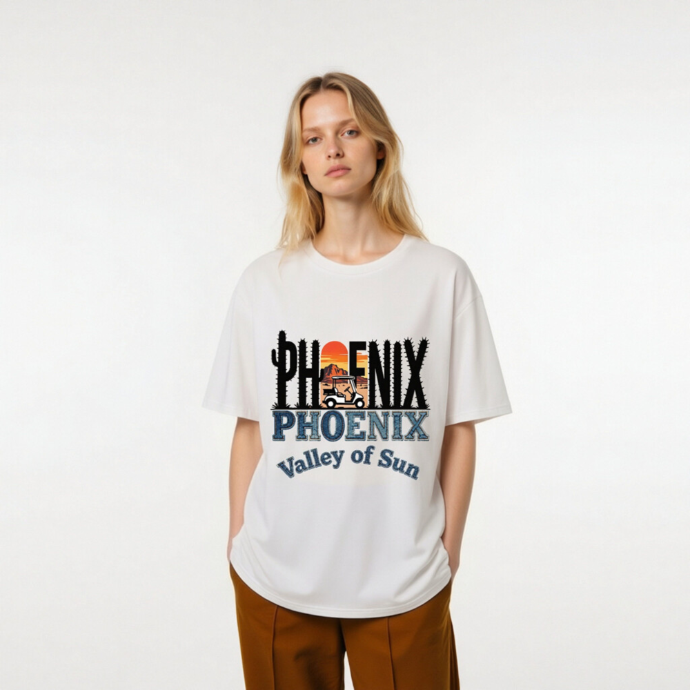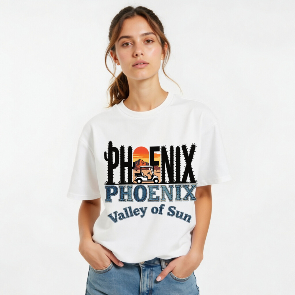 Wear the spirit of Phoenix with this unisex organic cotton t-shirt featuring a vibrant ‘Valley of Sun’ design: cactus-shaped letters, a sunset over mountains, and a golf cart. Soft, breathable, and ethically made for comfort and style. Perfect for desert lovers and local pride. Machine washable, sustainable fabric, true to size.