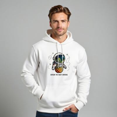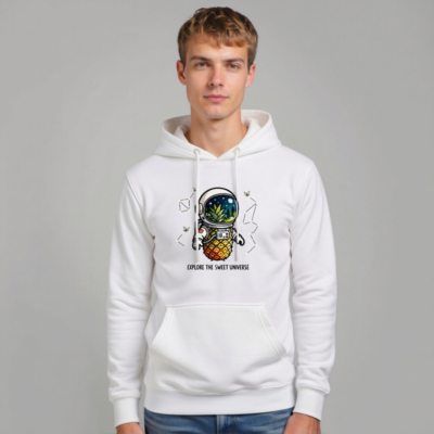 Discover our premium unisex pullover hoodie featuring a whimsical pineapple astronaut design—vibrant, playful, and perfect for cosmic foodies. The front graphic shows a pineapple in a space suit with a forested moon view inside the helmet, surrounded by constellations and bees. Soft, comfortable, and stylish for everyday wear. ‘Explore the Sweet Universe’ slogan adds charm. Ideal gift for space lovers and fruit enthusiasts alike.