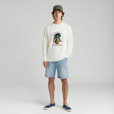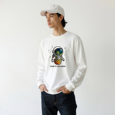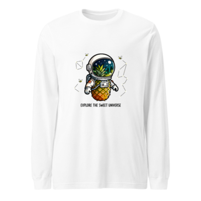 Adorable unisex long sleeve tee featuring a whimsical pineapple astronaut exploring space with a forest and moon inside the helmet. Perfect for cosmic foodies and sci-fi lovers. Soft, comfortable fit. ‘Explore the Sweet Universe’ slogan adds playful charm. Ideal gift for adventurers and pineapple fans.