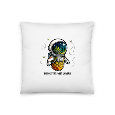 Adorable pineapple astronaut design on a soft, 18″x18″ basic pillow—perfect for adding whimsy to any room. Features a charming space-themed illustration with stars, trees, and bees, paired with the playful tagline ‘Explore the Sweet Universe.’ Ideal as a unique gift or cozy home decor accent.