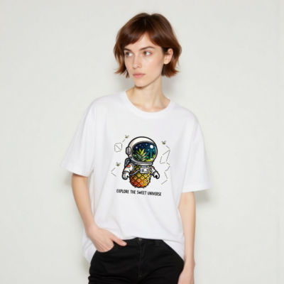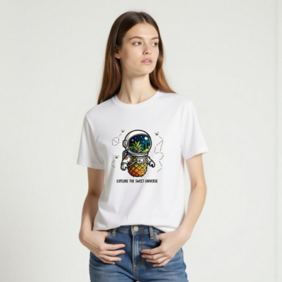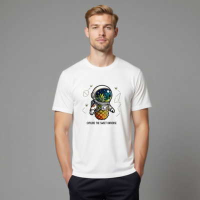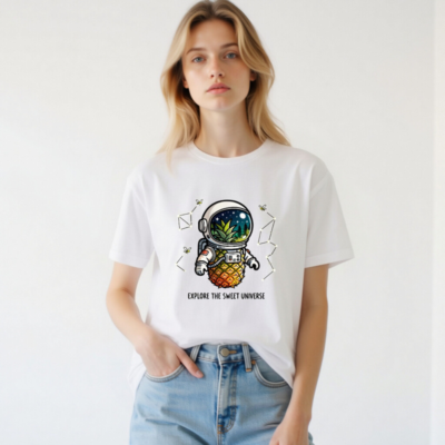 A playful unisex staple t-shirt featuring a whimsical pineapple astronaut exploring space with a lush jungle inside the helmet. Perfect for cosmic foodies and quirky adventurers. Soft, comfortable, and designed for everyday wear. ‘Explore the Sweet Universe’—a fun, eye-catching design that blends sci-fi and tropical vibes. Ideal for gifting or self-expression.