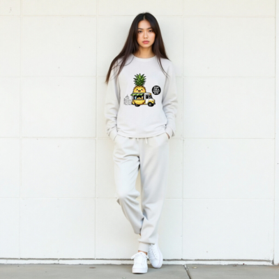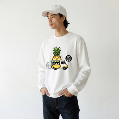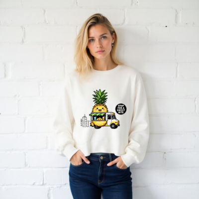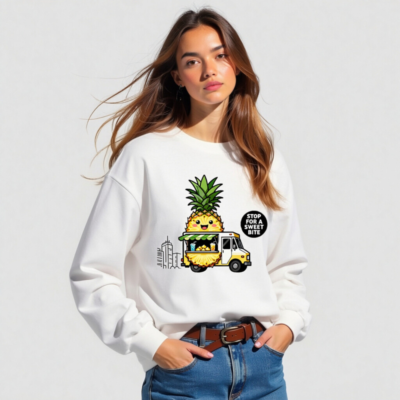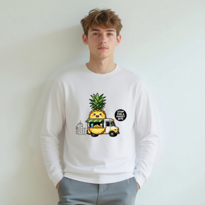 Adorable unisex long sleeve tee featuring a kawaii pineapple character driving a yellow food truck with tropical drinks and fruit. Perfect for fruit lovers and foodie fans. Comfortable, casual wear with playful design. ‘Stop for a Sweet Bite’ slogan adds charm. Great gift for pineapple enthusiasts.