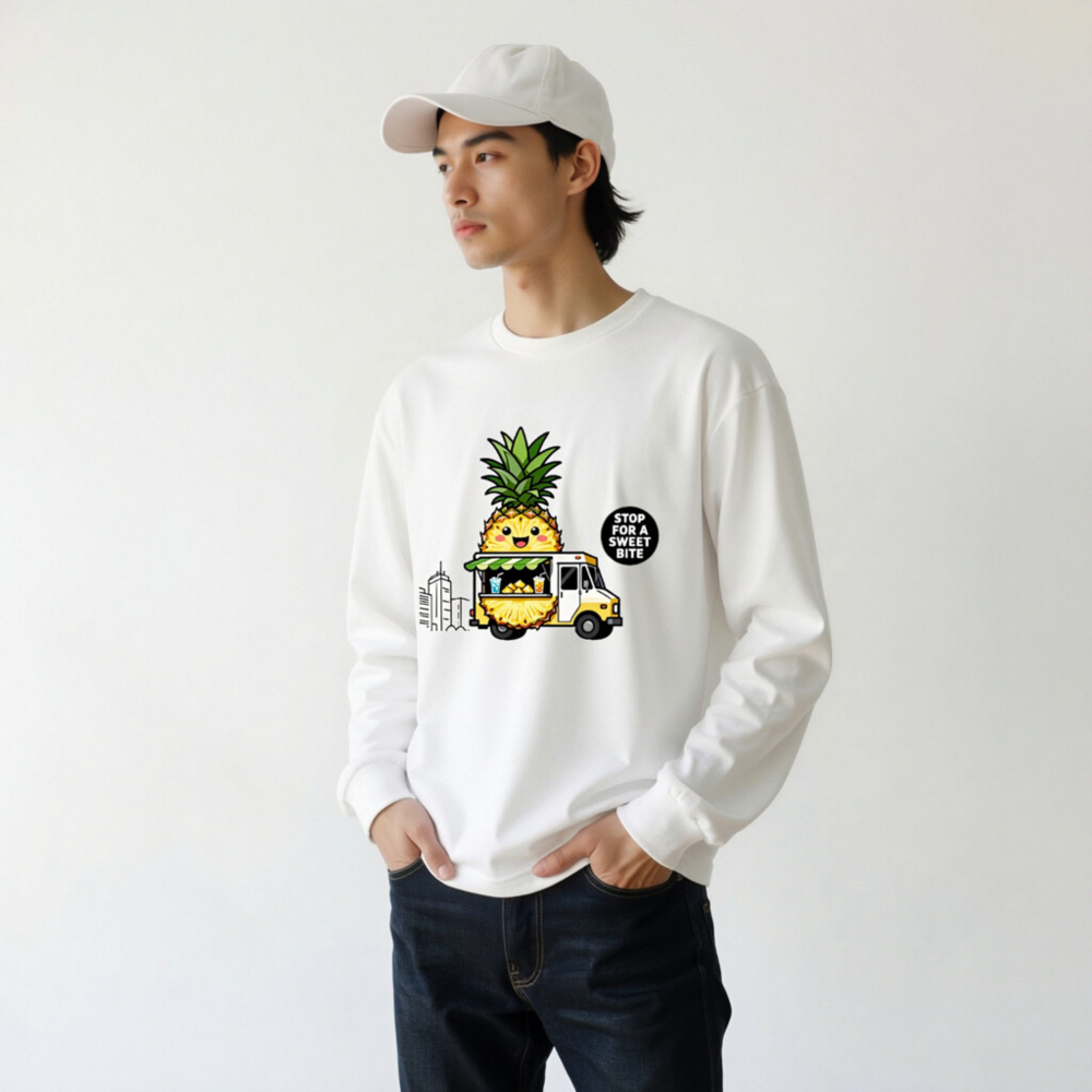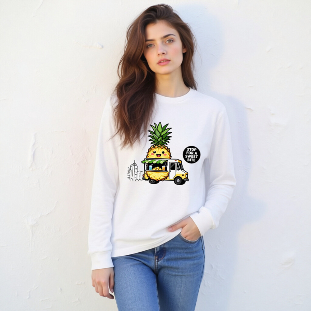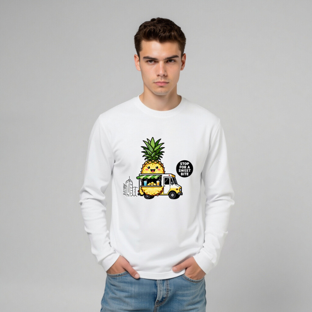 Adorable unisex long sleeve tee featuring a kawaii pineapple character driving a yellow food truck with tropical drinks and fruit. Perfect for fruit lovers and foodie fans. Comfortable, casual wear with playful design. ‘Stop for a Sweet Bite’ slogan adds charm. Great gift for pineapple enthusiasts.