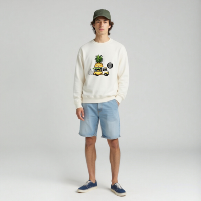 Adorable unisex crew neck sweatshirt featuring a kawaii pineapple food truck with cheerful expression, green canopy, and tropical drinks. Perfect for fruit lovers and foodie fashion. Soft, comfortable, and stylish—ideal for casual wear. ‘Stop for a Sweet Bite’ slogan adds playful charm. Machine washable for easy care.