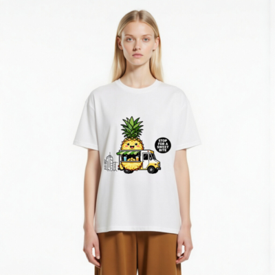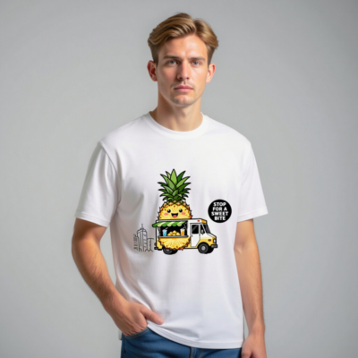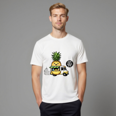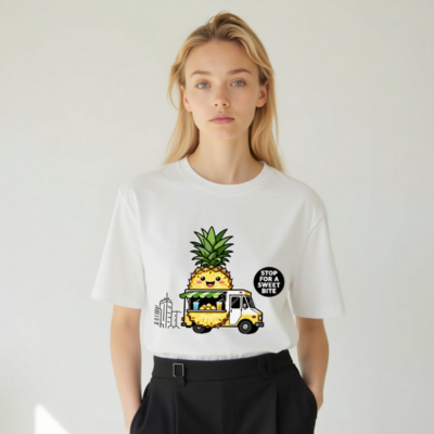 Adorable pineapple food truck design on a soft, unisex organic cotton t-shirt. Features cheerful kawaii pineapple character serving drinks and fruit—perfect for fruit lovers and foodie fans. Comfortable, eco-friendly, and stylish. ‘Stop for a Sweet Bite’ slogan adds fun charm. Made with 100% organic cotton for gentle wear.