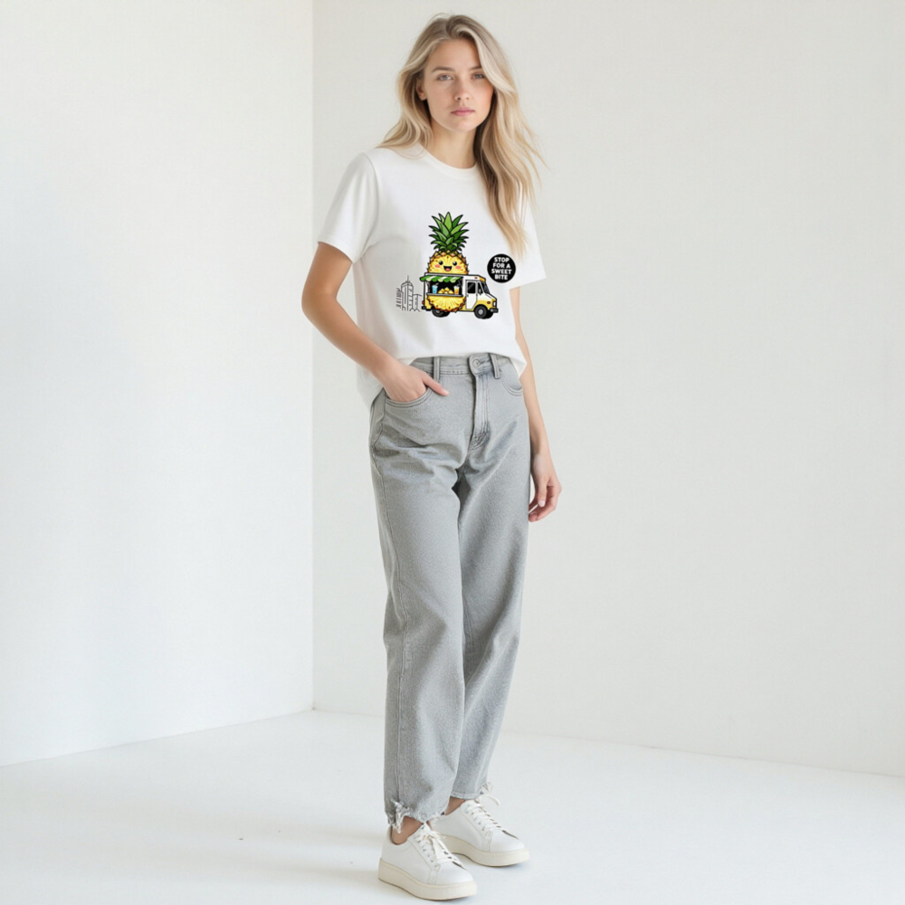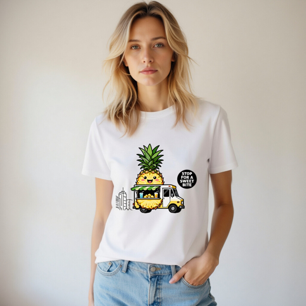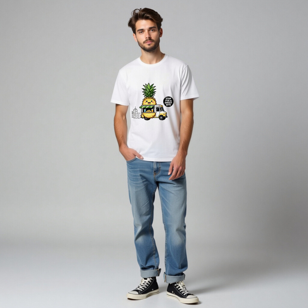 Adorable pineapple food truck design on a soft, unisex organic cotton t-shirt. Features cheerful kawaii pineapple character serving drinks and fruit—perfect for fruit lovers and foodie fans. Comfortable, eco-friendly, and stylish. ‘Stop for a Sweet Bite’ slogan adds fun charm. Made with 100% organic cotton for gentle wear.