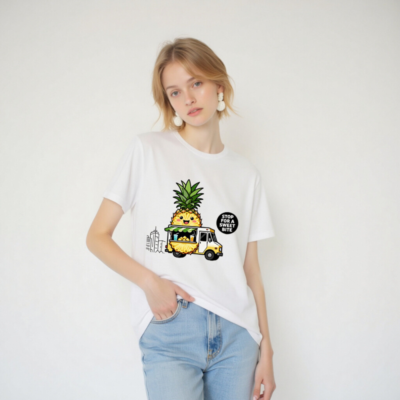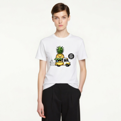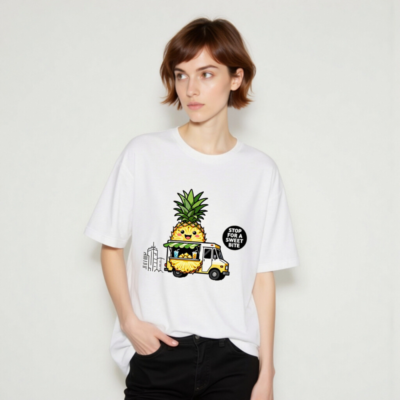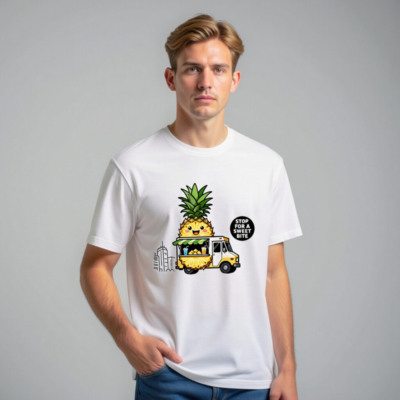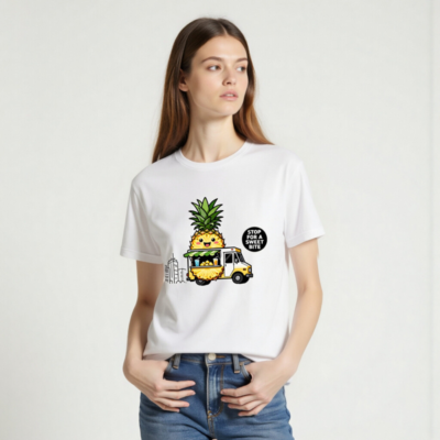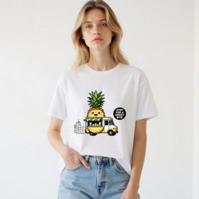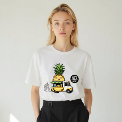 Adorable pineapple food truck design on a comfortable unisex staple t-shirt. Perfect for fruit lovers and foodie fans—fun, kawaii, and eye-catching. Soft cotton blend, classic fit, great for casual wear. ‘Stop for a Sweet Bite’ slogan adds playful charm. Ideal gift for birthdays, holidays, or self-indulgence. Premium quality, machine washable, eco-friendly packaging.
