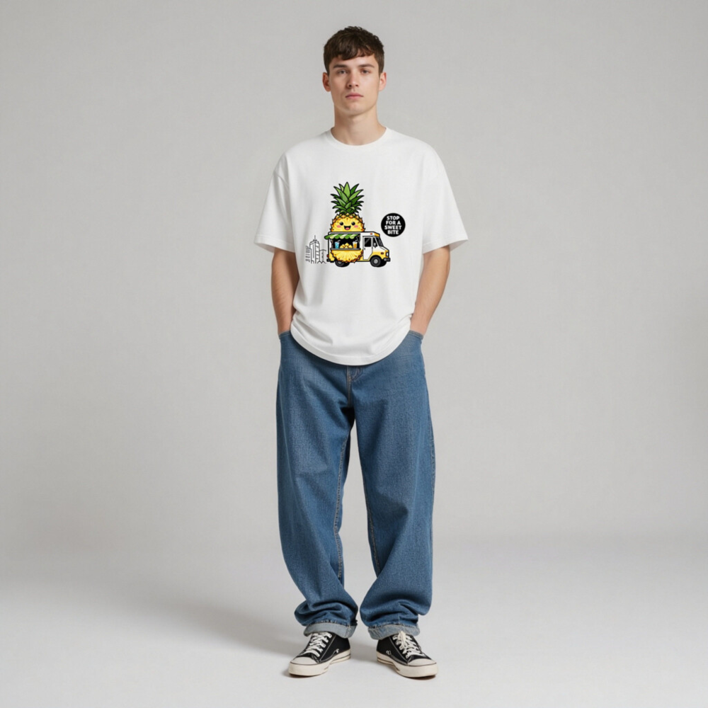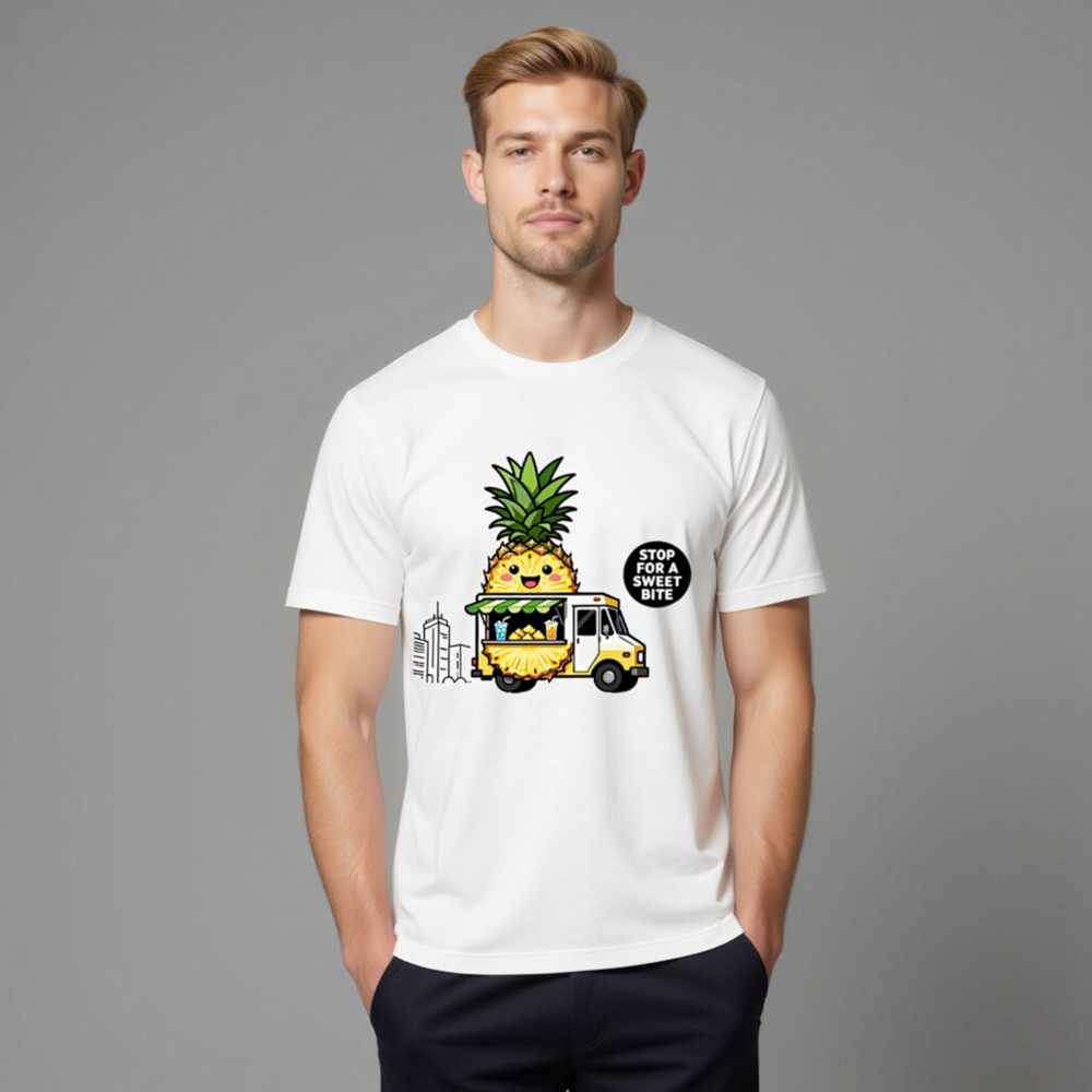 Adorable pineapple food truck design on a comfortable unisex staple t-shirt. Perfect for fruit lovers and foodie fans—fun, kawaii, and eye-catching. Soft cotton blend, classic fit, great for casual wear. ‘Stop for a Sweet Bite’ slogan adds playful charm. Ideal gift for birthdays, holidays, or self-indulgence. Premium quality, machine washable, eco-friendly packaging.