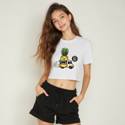 Adorable pineapple-themed women’s crop top featuring a kawaii food truck design with cheerful pineapple character, green awning, and drinks. Perfect for fruit lovers and street food fans. Short, stylish, and fun—ideal for casual wear. ‘Stop for a Sweet Bite’ slogan adds playful charm. Soft cotton blend, comfortable fit, great for summer.