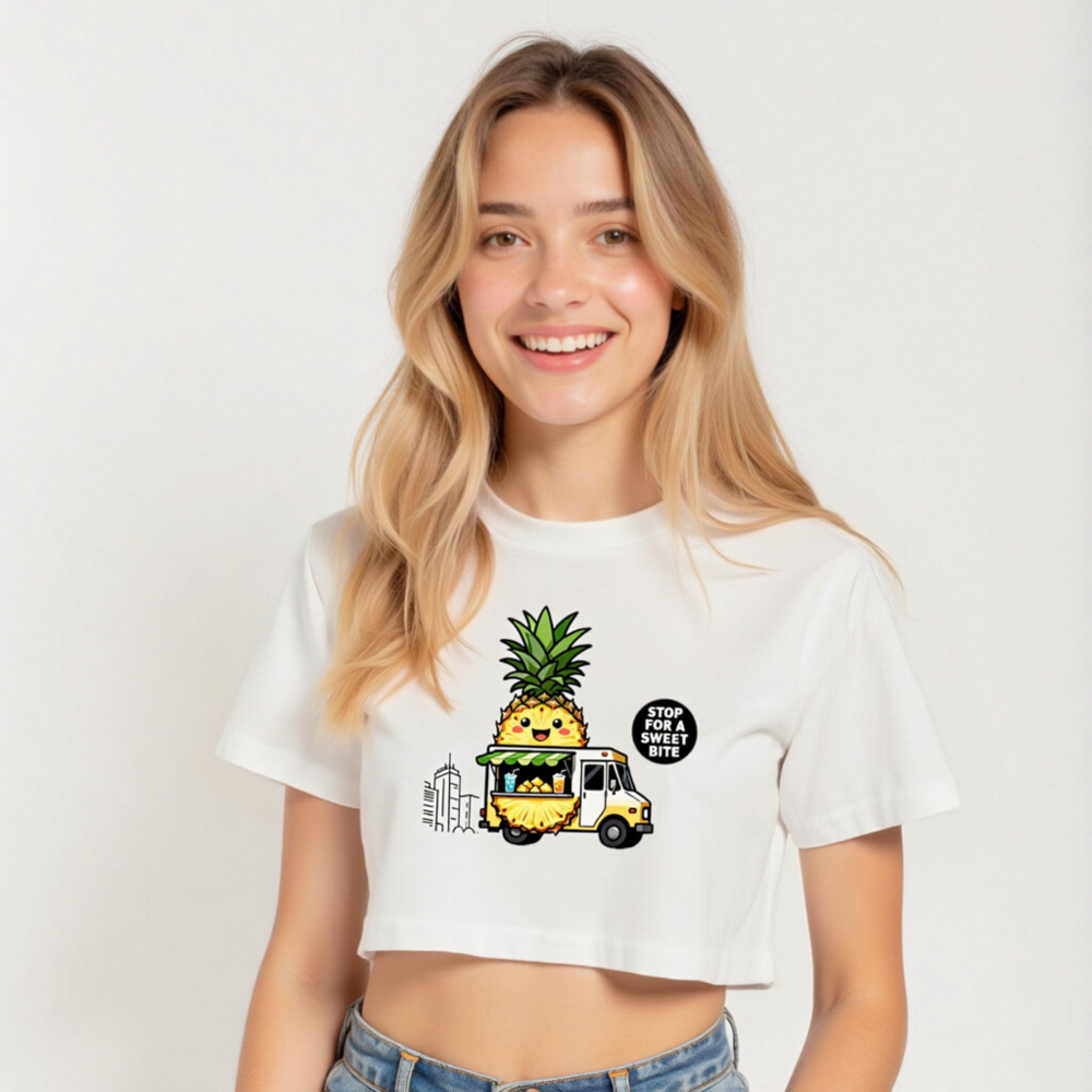 Adorable pineapple-themed women’s crop top featuring a kawaii food truck design with cheerful pineapple character, green awning, and drinks. Perfect for fruit lovers and street food fans. Short, stylish, and fun—ideal for casual wear. ‘Stop for a Sweet Bite’ slogan adds playful charm. Soft cotton blend, comfortable fit, great for summer.