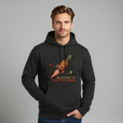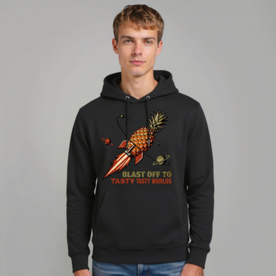 Unisex essential eco hoodie featuring a playful pineapple rocket soaring through space with planets—’Blast Off to Tasty Tasty Worlds’ slogan. Made from sustainable materials, this comfortable hooded sweatshirt combines whimsical design with eco-conscious values. Ideal for food lovers and space enthusiasts seeking fun, planet-friendly apparel.