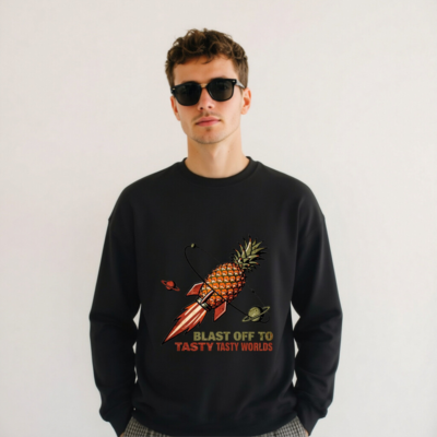 A fun, unisex crew neck sweatshirt featuring a retro-style pineapple rocket blasting through space with planets. The bold graphic and playful slogan ‘Blast Off to Tasty Tasty Worlds’ make it perfect for food lovers and sci-fi fans. Soft, comfortable fit — ideal for casual wear or as a quirky gift. Designed for everyday comfort with durable print.