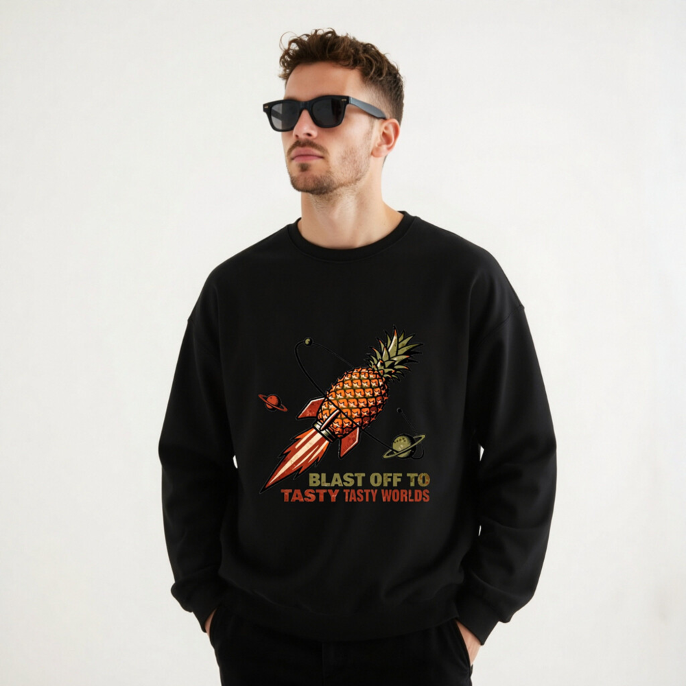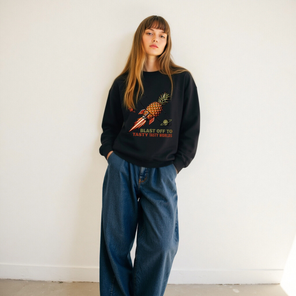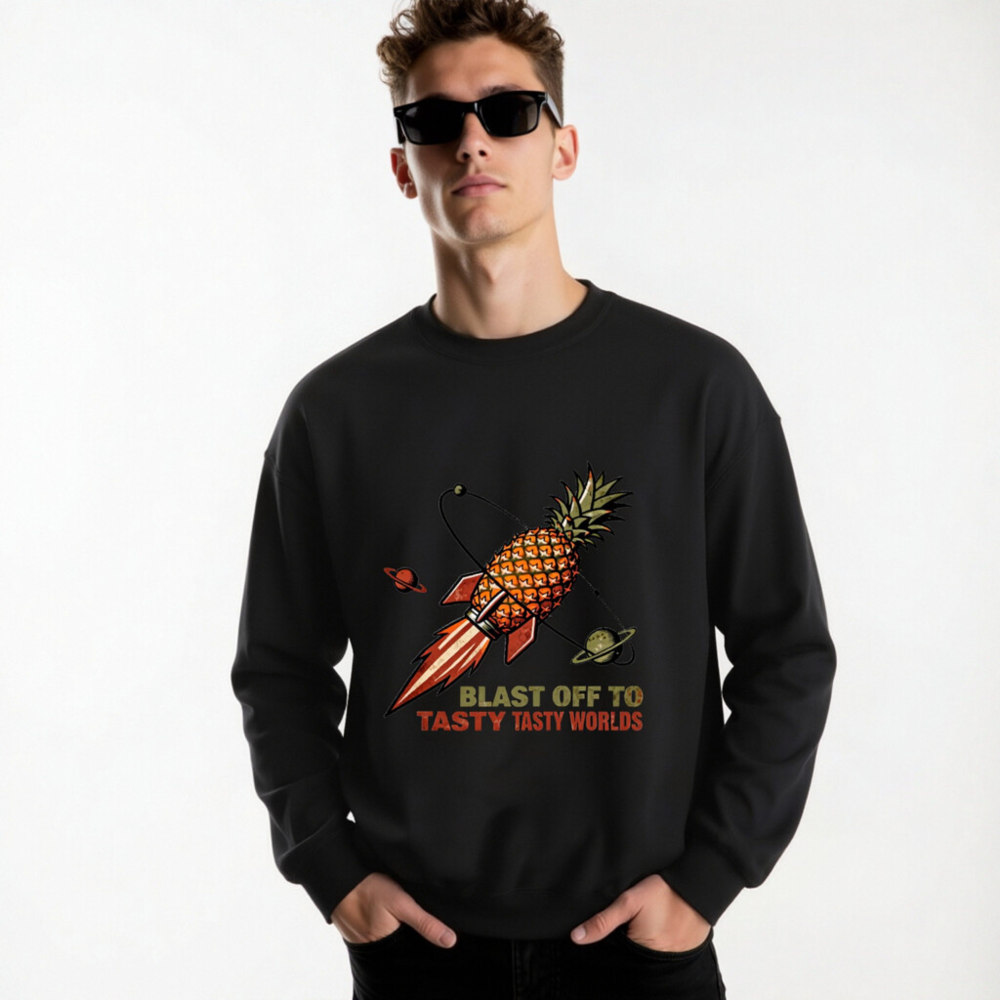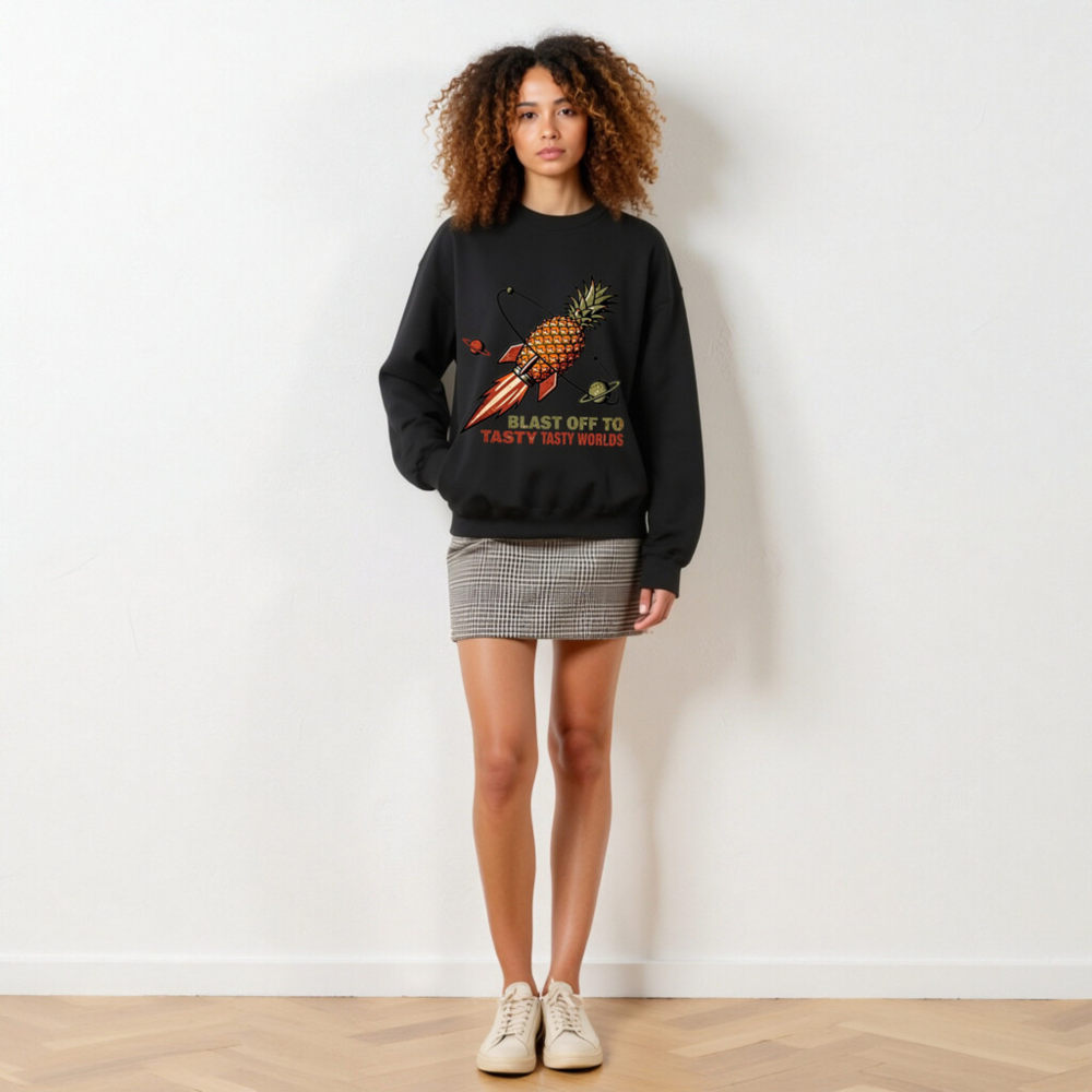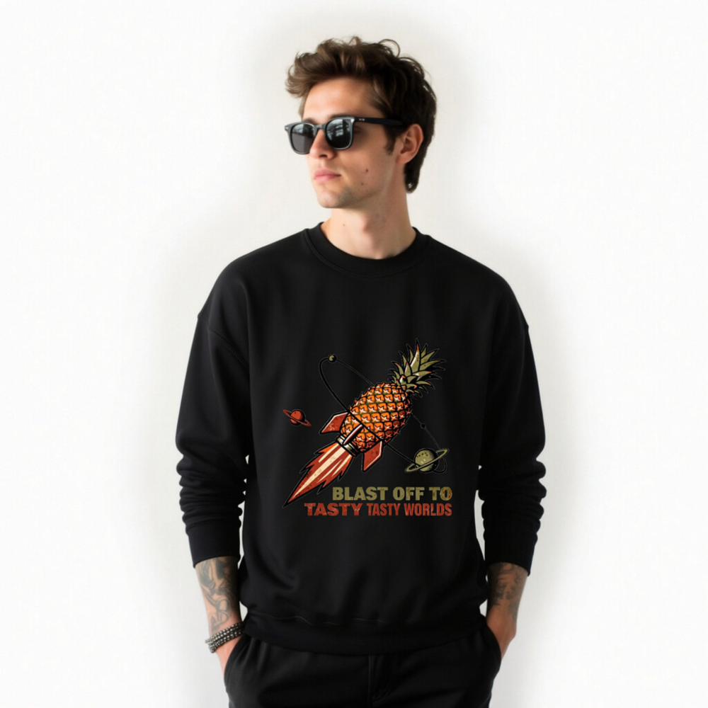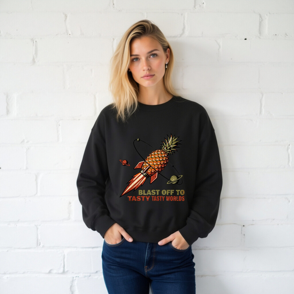 A fun, unisex crew neck sweatshirt featuring a retro-style pineapple rocket blasting through space with planets. The bold graphic and playful slogan ‘Blast Off to Tasty Tasty Worlds’ make it perfect for food lovers and sci-fi fans. Soft, comfortable fit — ideal for casual wear or as a quirky gift. Designed for everyday comfort with durable print.