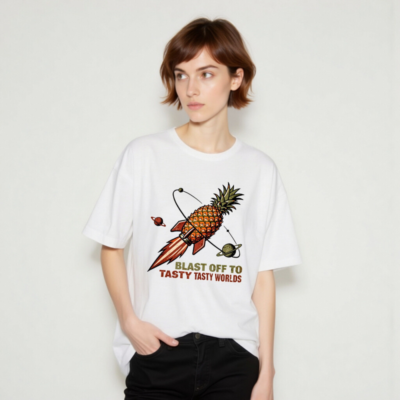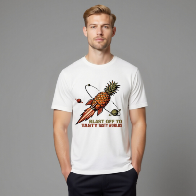 Unisex staple t-shirt featuring a whimsical pineapple rocket soaring through space with orbiting planets. Bold retro-style graphic and playful slogan ‘Blast Off to Tasty Tasty Worlds’ for fun, foodie-inspired fashion. Soft cotton blend, classic fit, perfect for everyday wear. Ideal gift for pineapple lovers and space enthusiasts.
