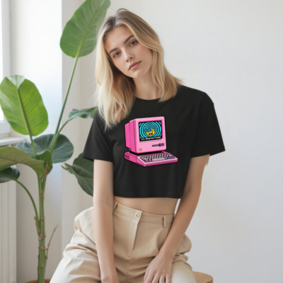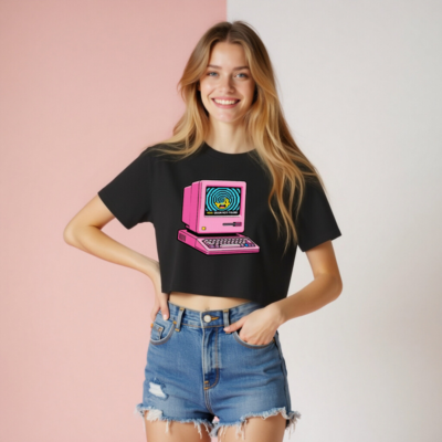 Show off your tech-savvy humor with this women’s crop top featuring a vibrant pink retro computer design. The screen displays a hypnotic spiral and a surprised yellow face with the playful error message ‘404: BRAIN NOT FOUND’—perfect for coding fans, gamers, and lovers of quirky vintage aesthetics. Made from soft, comfortable fabric, it pairs effortlessly with high-waisted jeans or skirts for a bold, nostalgic look. A fun statement piece that celebrates digital culture with style.