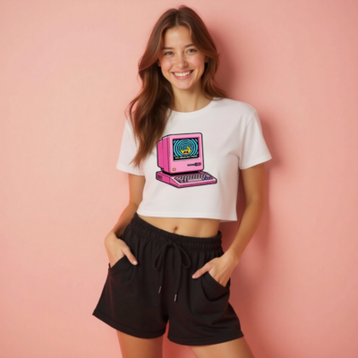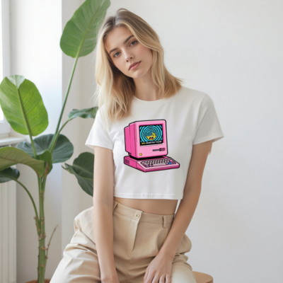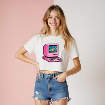 This women’s crop top features a vibrant pink retro computer with a hypnotic spiral and ‘404: BRAIN NOT FOUND’ error message on the screen—perfect for tech lovers, gamers, and fans of nostalgic digital humor. Made from soft, comfortable fabric with a relaxed fit. Ideal for casual wear, gaming events, or as a fun statement piece. Style code: RT-PC-404.