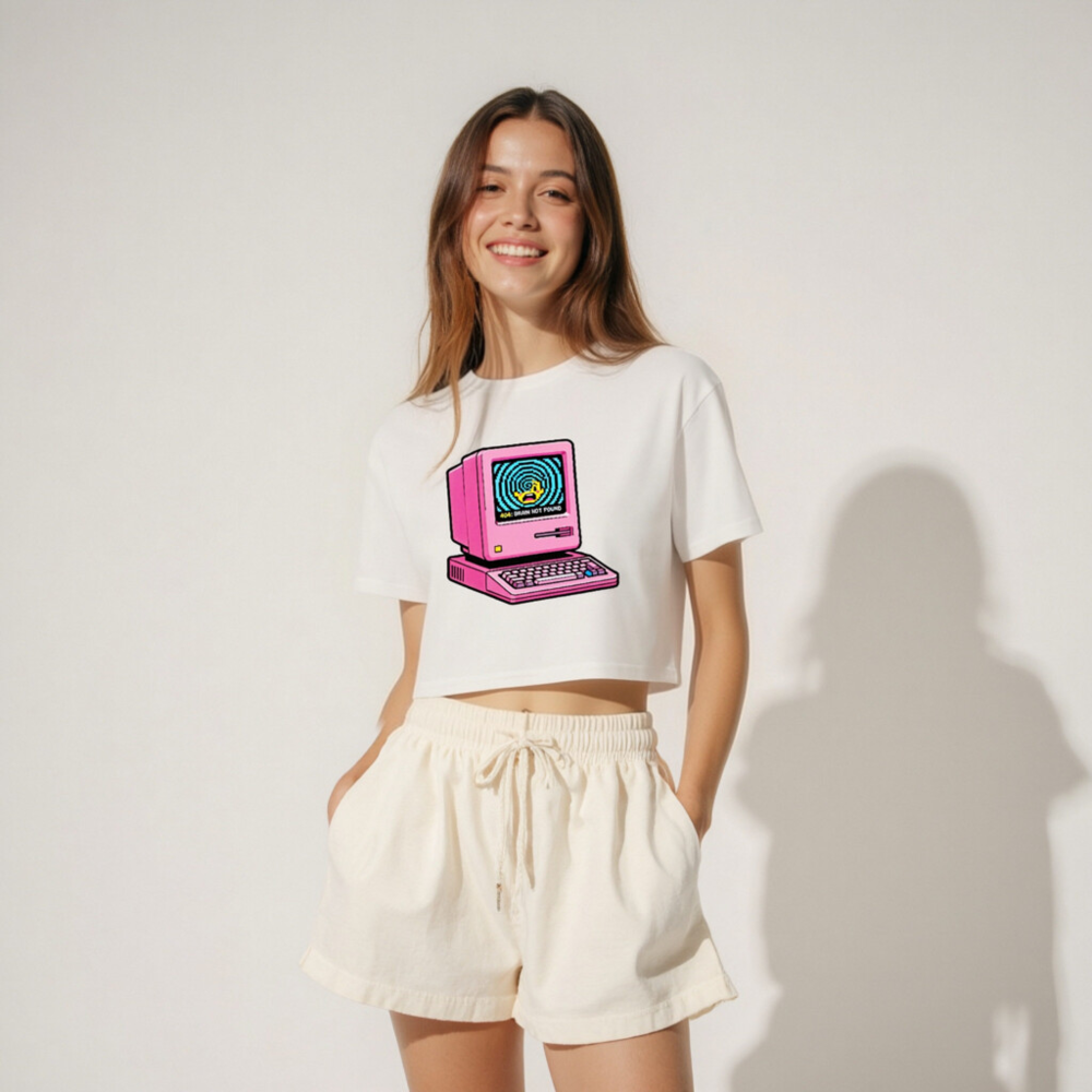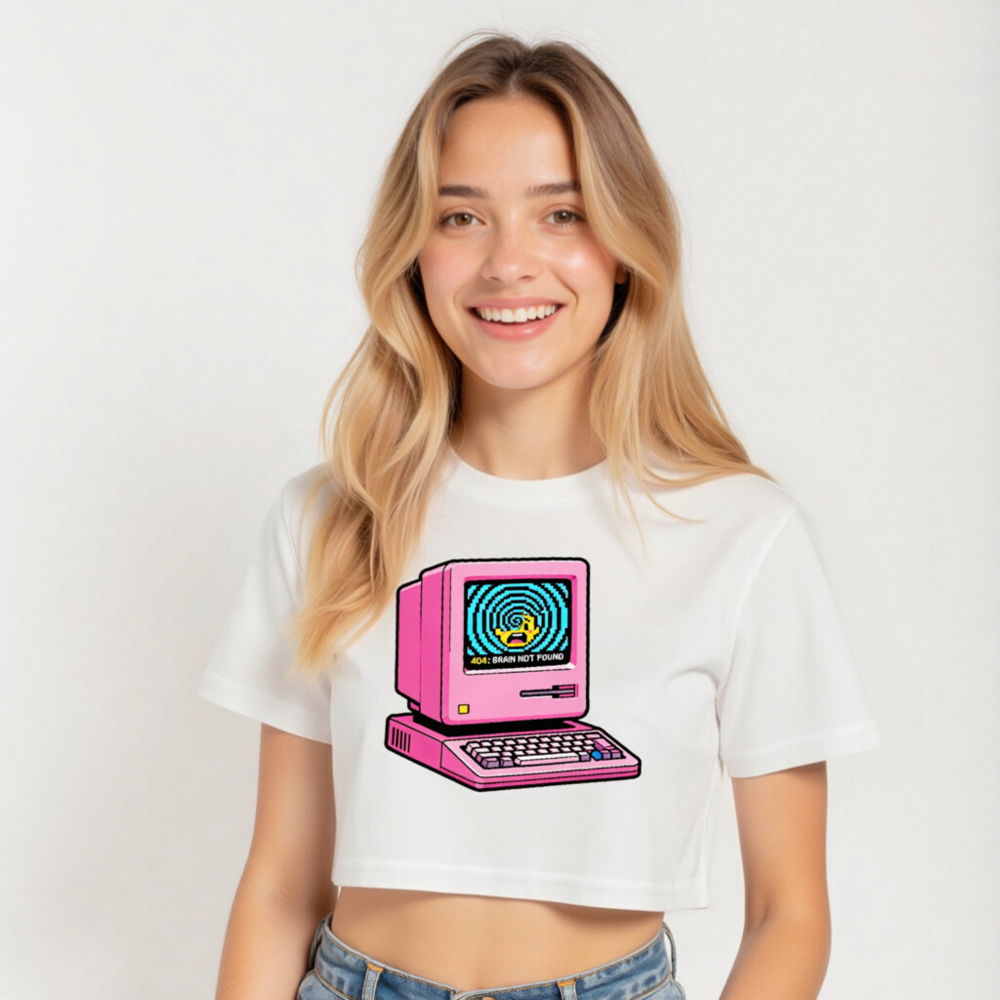This women’s crop top features a vibrant pink retro computer with a hypnotic spiral and ‘404: BRAIN NOT FOUND’ error message on the screen—perfect for tech lovers, gamers, and fans of nostalgic digital humor. Made from soft, comfortable fabric with a relaxed fit. Ideal for casual wear, gaming events, or as a fun statement piece. Style code: RT-PC-404.