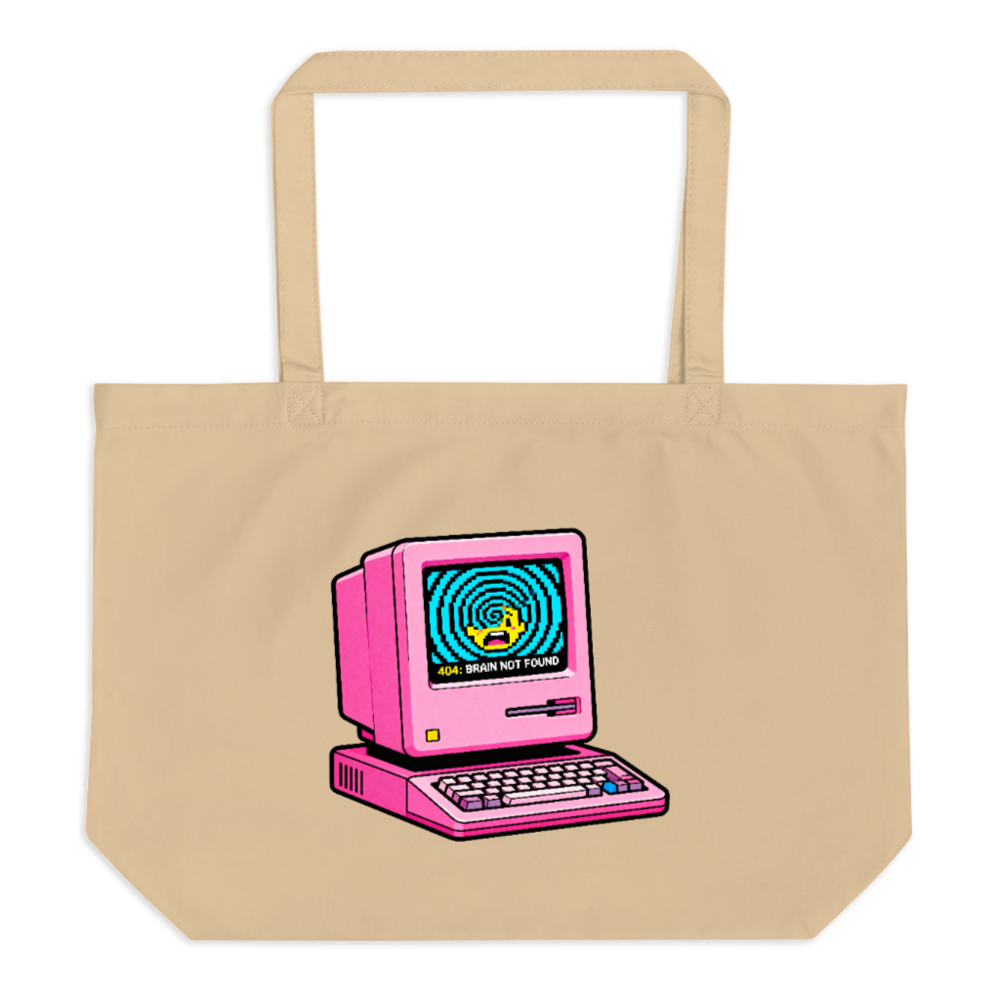This large organic cotton tote bag features a vibrant retro pink computer design with a pixel-art ‘404: BRAIN NOT FOUND’ error screen—perfect for tech lovers and eco-conscious shoppers. Made from certified organic cotton, it’s durable, reusable, and supports sustainable living. Ideal for groceries, work, or travel—wherever you need a stylish, planet-friendly carryall.