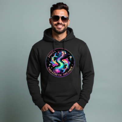Celebrate your Pisces spirit with this unisex premium pullover hoodie featuring a vibrant, cosmic design of two rainbow fish and jellyfish swirling in a starry nebula. The ‘Pisces Empathetic Dreamer’ circular motif captures the zodiac’s intuitive, dreamy essence. Soft, comfortable, and stylish—ideal for astrology lovers seeking meaningful, high-quality apparel.
