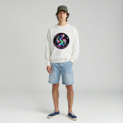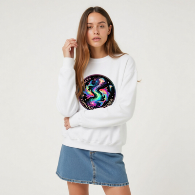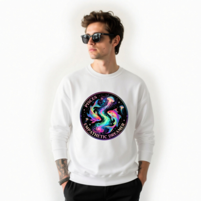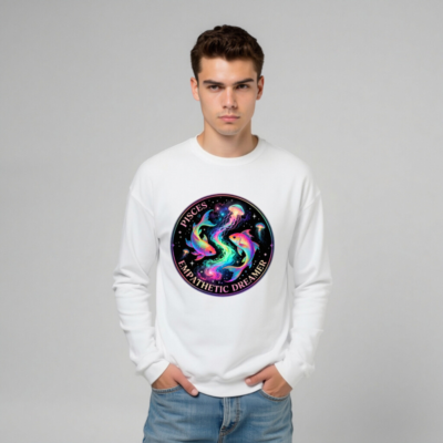 Wear the Pisces zodiac sign with this unisex crew neck sweatshirt featuring a vibrant cosmic design: two rainbow fish swirling around glowing jellyfish against a starry background. The circular graphic includes ‘PISCES’ and ‘EMPATHETIC DREAMER’ text, perfect for dreamers and astrology lovers. Soft, comfortable, and stylish—ideal for everyday wear or as a meaningful gift.
