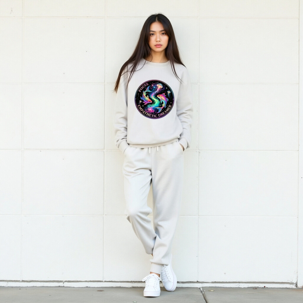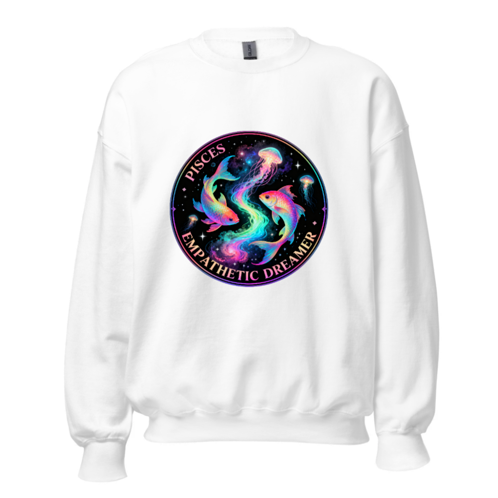 Wear the Pisces zodiac sign with this unisex crew neck sweatshirt featuring a vibrant cosmic design: two rainbow fish swirling around glowing jellyfish against a starry background. The circular graphic includes ‘PISCES’ and ‘EMPATHETIC DREAMER’ text, perfect for dreamers and astrology lovers. Soft, comfortable, and stylish—ideal for everyday wear or as a meaningful gift.