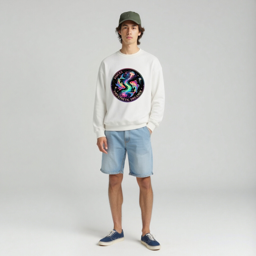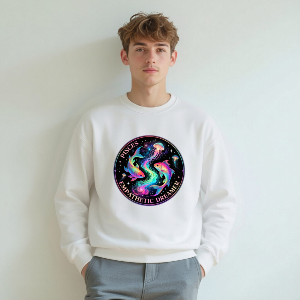 Pisces Empathetic Dreamer Unisex Crew Neck Sweatshirt – Rainbow Fish & Jellyfish Cosmic Design