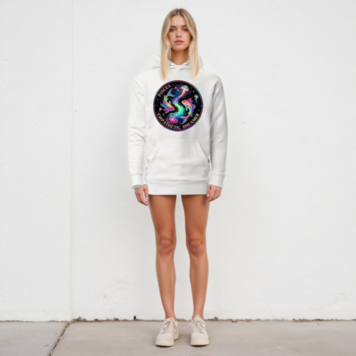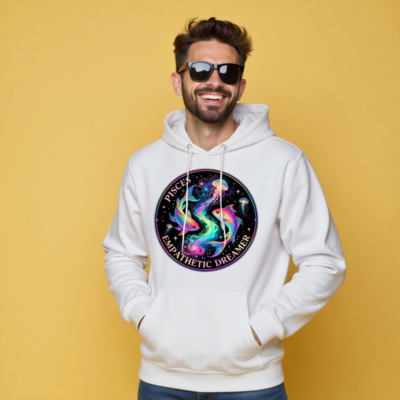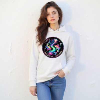 Celebrate your Pisces spirit with this premium unisex pullover hoodie featuring a vibrant cosmic design: two rainbow fish and glowing jellyfish swirling in a starry nebula. The ‘Pisces Empathetic Dreamer’ text highlights your intuitive, compassionate nature. Soft, comfortable fit—ideal for dreamers and astrology lovers seeking meaningful, stylish apparel.
