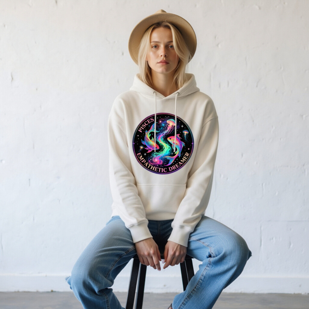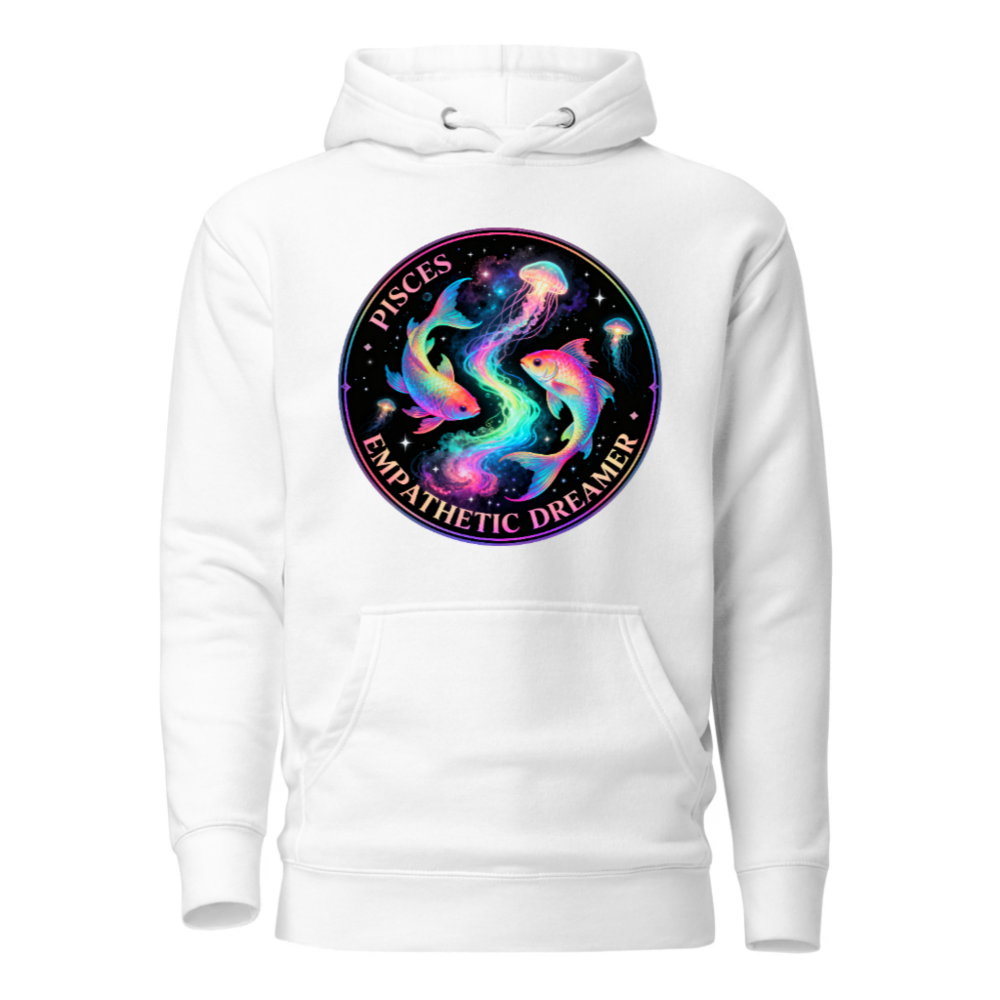 Celebrate your Pisces spirit with this premium unisex pullover hoodie featuring a vibrant cosmic design: two rainbow fish and glowing jellyfish swirling in a starry nebula. The ‘Pisces Empathetic Dreamer’ text highlights your intuitive, compassionate nature. Soft, comfortable fit—ideal for dreamers and astrology lovers seeking meaningful, stylish apparel.
