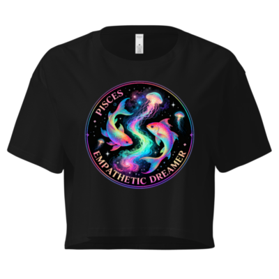Celebrate your Pisces spirit with this vibrant women’s crop top featuring a cosmic yin-yang of rainbow fish and jellyfish, surrounded by stars and nebulae. The ‘Empathetic Dreamer’ phrase wraps the design—perfect for astrology lovers seeking expressive, dreamy fashion. Soft, comfortable fit; ideal for casual wear or celestial-themed events.