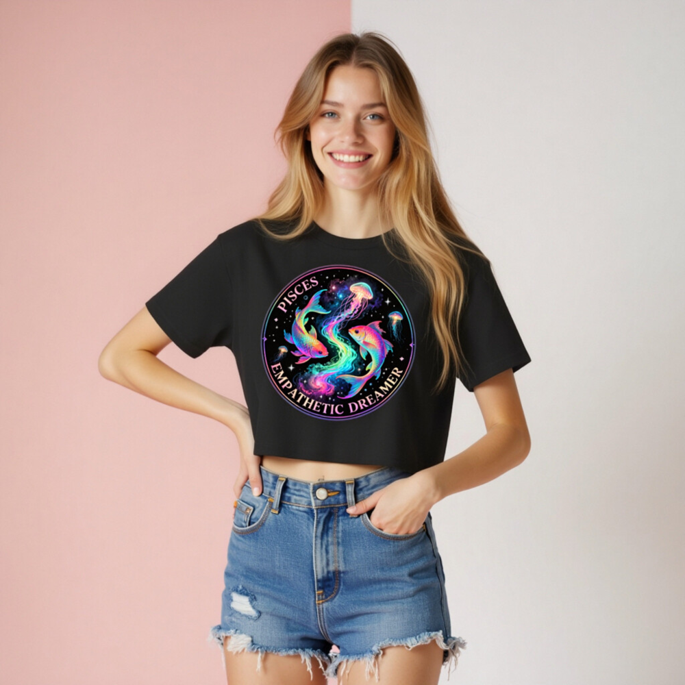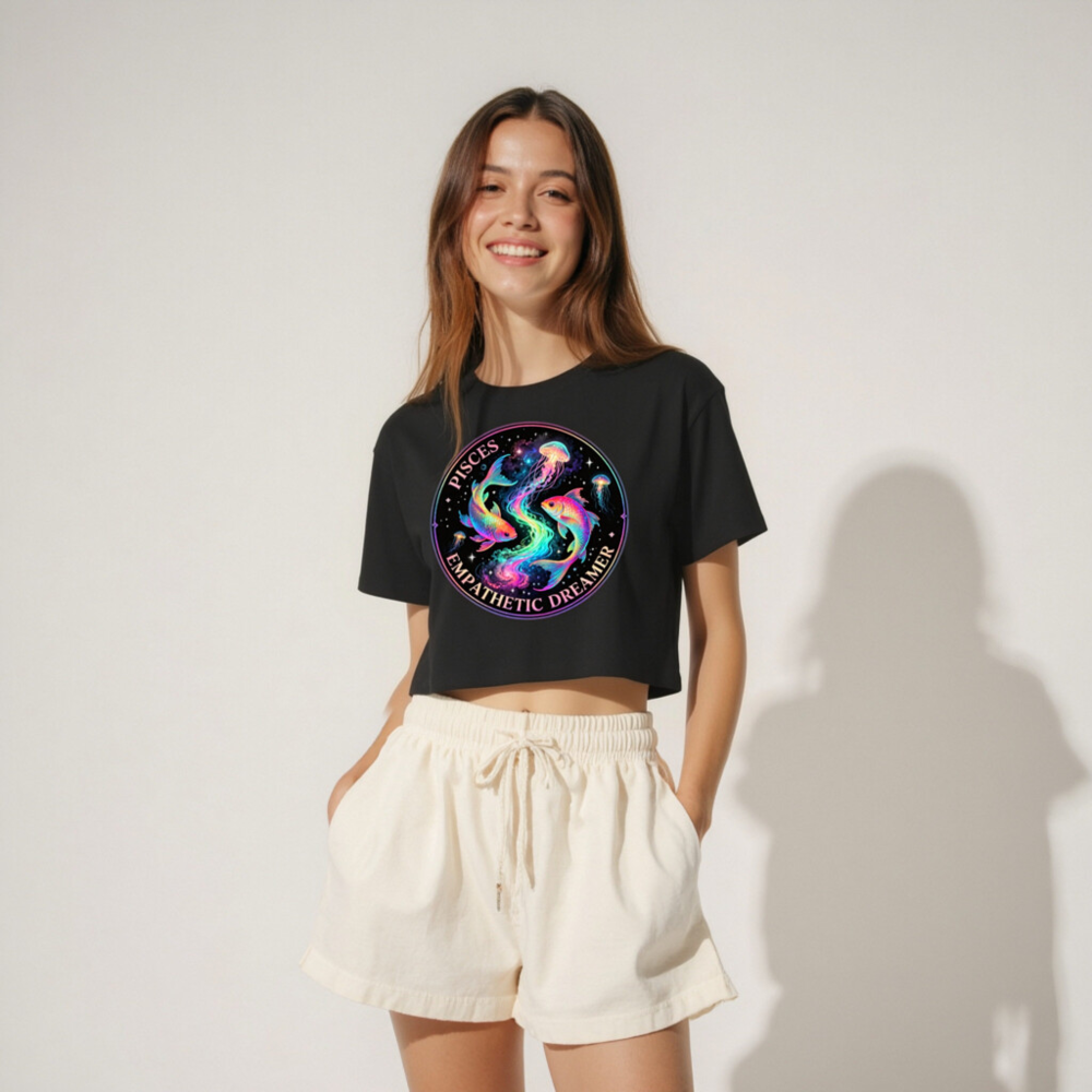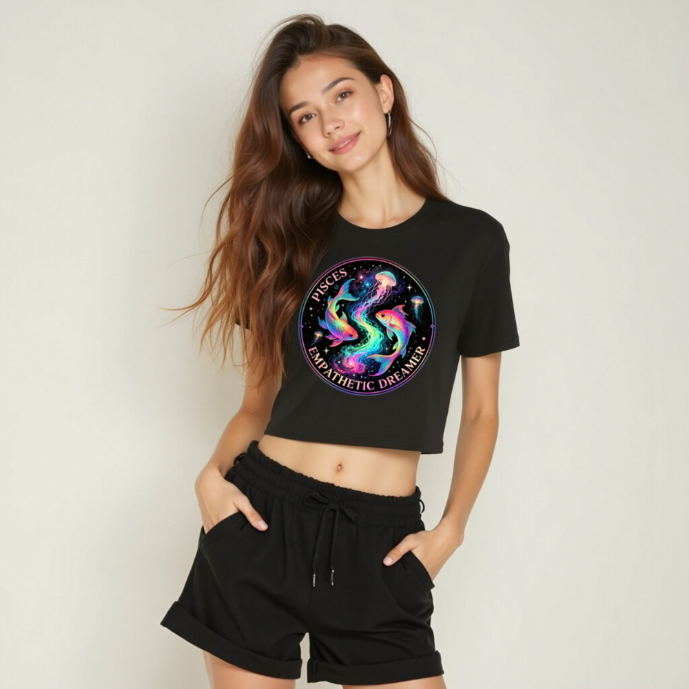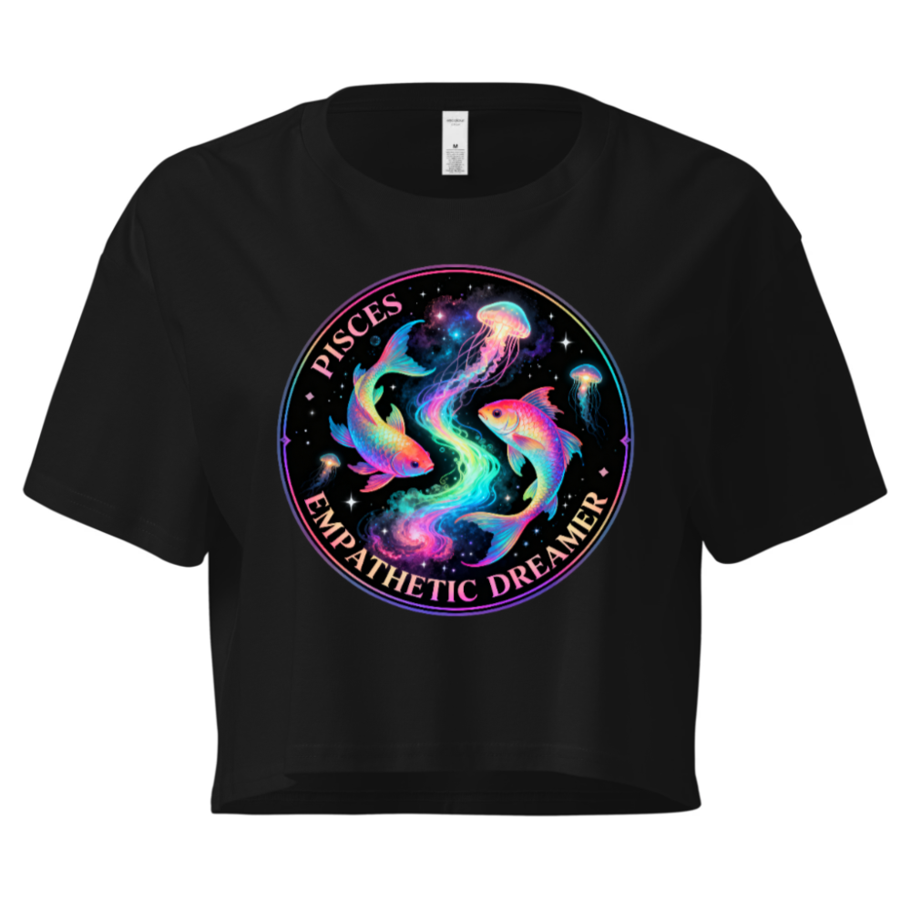 Celebrate your Pisces spirit with this vibrant women’s crop top featuring a cosmic yin-yang of rainbow fish and jellyfish, surrounded by stars and nebulae. The ‘Empathetic Dreamer’ phrase wraps the design—perfect for astrology lovers seeking expressive, dreamy fashion. Soft, comfortable fit; ideal for casual wear or celestial-themed events.