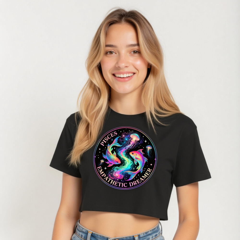 Pisces Empathetic Dreamer Women’s Crop Top – Rainbow Fish & Jellyfish Astrology Design