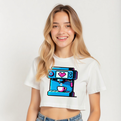 Show your love for coffee and retro gaming with this women’s crop top featuring a vibrant pixel-art espresso machine printing a heart-shaped steam into a pink cup. Designed for casual comfort, this white short-sleeve tee fits true to size and is made from soft, breathable cotton. Ideal for coffee lovers, gamers, or anyone who appreciates nostalgic digital art. Perfect for everyday wear or as a fun gift.