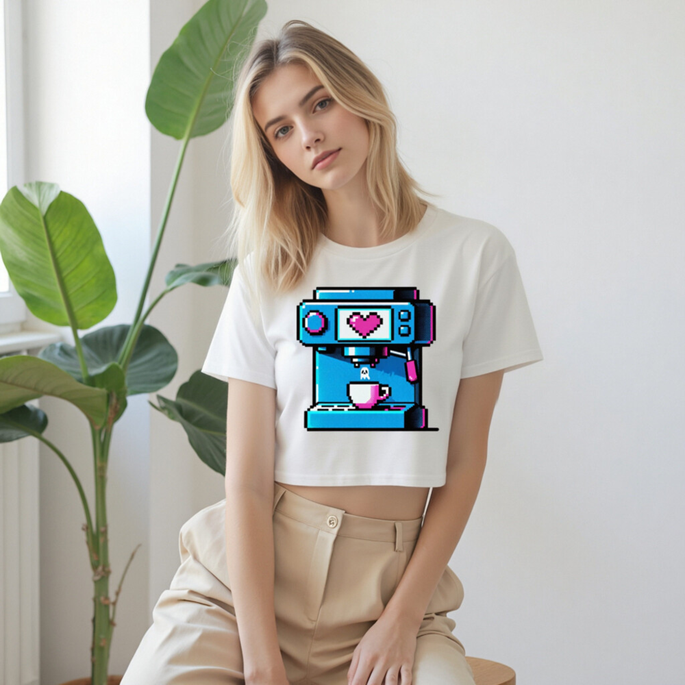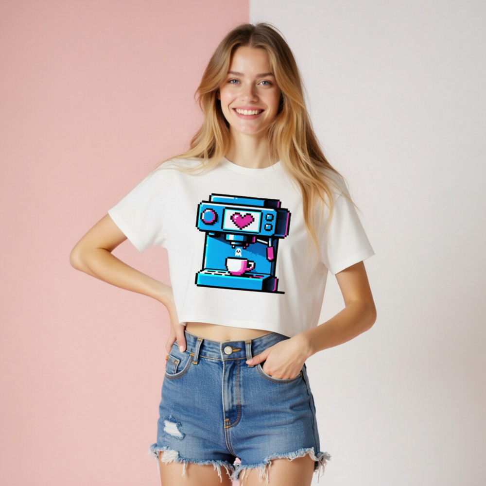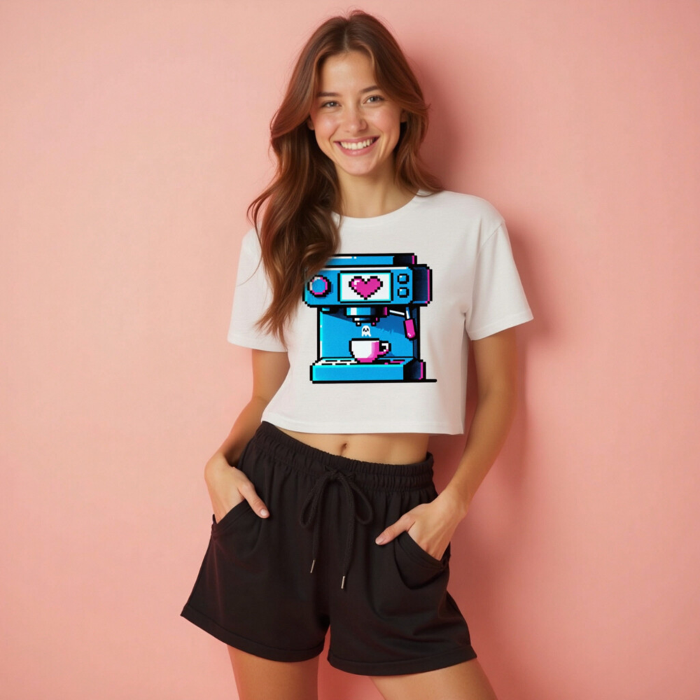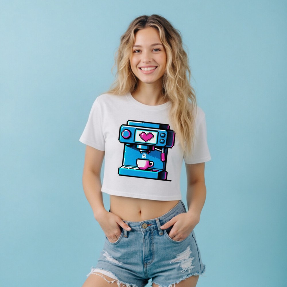 Show your love for coffee and retro gaming with this women’s crop top featuring a vibrant pixel-art espresso machine printing a heart-shaped steam into a pink cup. Designed for casual comfort, this white short-sleeve tee fits true to size and is made from soft, breathable cotton. Ideal for coffee lovers, gamers, or anyone who appreciates nostalgic digital art. Perfect for everyday wear or as a fun gift.