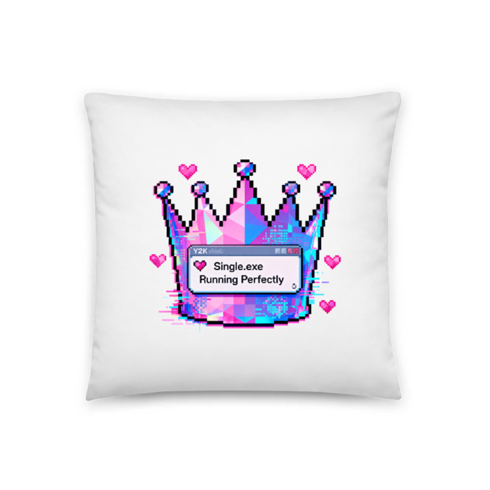 This 18″x18″ basic pillow features a vibrant pixel-art crown with glitch effects and pink hearts, overlaying a retro Windows-style dialog box reading ‘Single.exe Running Perfectly’. The design blends nostalgic tech aesthetics with modern digital art. Ideal for gamers, coders, or anyone who loves quirky, eye-catching home decor. Soft cotton blend, machine washable. No certifications or claims added beyond what’s visibly depicted.