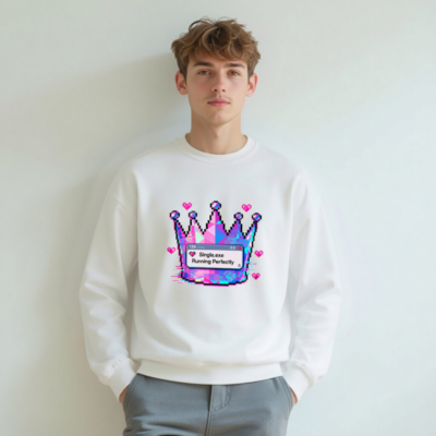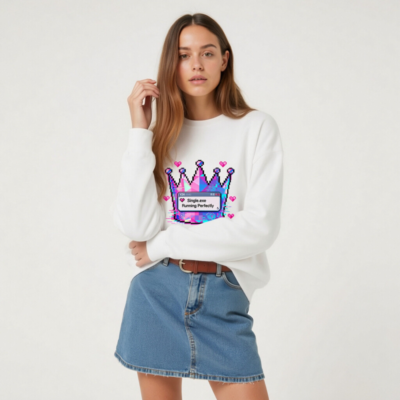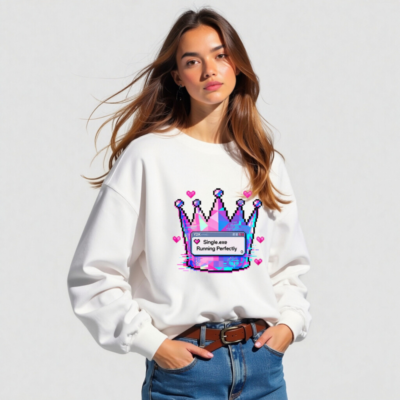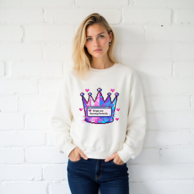 This unisex crew neck sweatshirt features a vibrant pixel-art crown with glitch effects and floating hearts. The central design includes a retro Windows-style window displaying ‘Single.exe Running Perfectly’—a playful nod to digital nostalgia. Crafted for comfort, it’s ideal for fans of 90s aesthetics, gaming culture, and expressive streetwear. Soft cotton blend, relaxed fit, perfect for everyday wear.