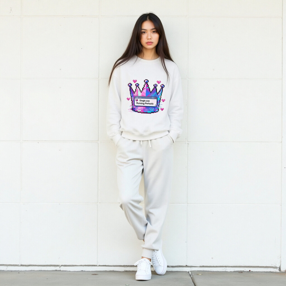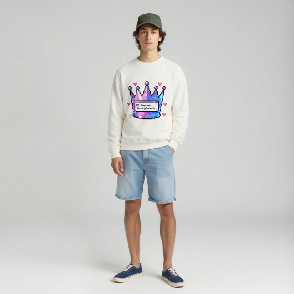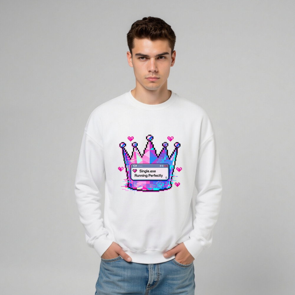 This unisex crew neck sweatshirt features a vibrant pixel-art crown with glitch effects and floating hearts. The central design includes a retro Windows-style window displaying ‘Single.exe Running Perfectly’—a playful nod to digital nostalgia. Crafted for comfort, it’s ideal for fans of 90s aesthetics, gaming culture, and expressive streetwear. Soft cotton blend, relaxed fit, perfect for everyday wear.