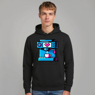 Show your love for coffee with this vibrant pixel-art hoodie featuring a retro-style espresso machine pouring into a cup, its screen glowing with a pink heart. Designed as an unisex essential eco hoodie, it combines cozy comfort with nostalgic digital charm—perfect for coffee lovers and retro gamers. Made with sustainable materials for everyday wear.