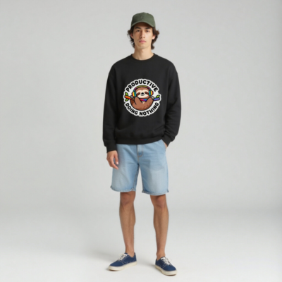 Cute unisex crew neck sweatshirt featuring a cozy sloth wearing rainbow headphones, hugging a colorful branch. The playful ‘Productive Doing Nothing’ circular design blends humor and relaxation—perfect for lazy days or productivity satire. Soft black fabric, comfortable fit, versatile for all genders. Ideal gift for chill lovers & meme fans.