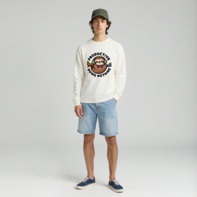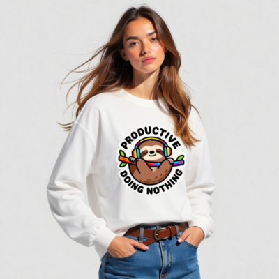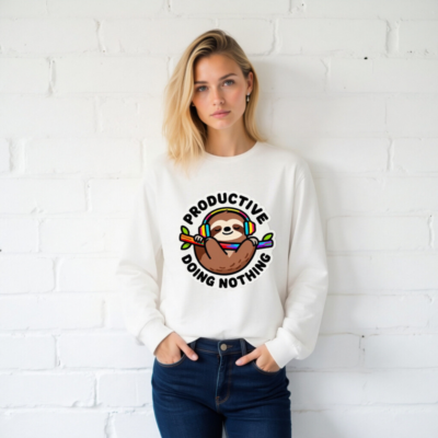 This unisex long sleeve tee features a cute sloth wearing rainbow headphones, hugging a colorful branch—perfect for relaxed productivity lovers. The playful ‘Productive Doing Nothing’ circular design blends humor with comfort. Soft cotton blend, gender-neutral fit, ideal for casual wear or as a fun gift. Designed for everyday ease and joyful self-expression.
