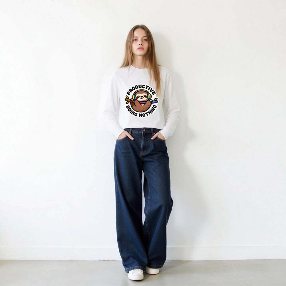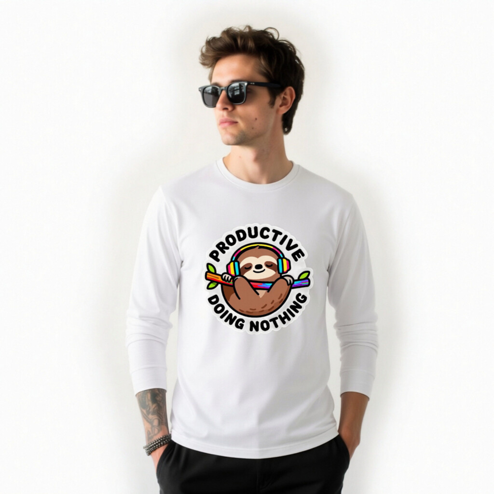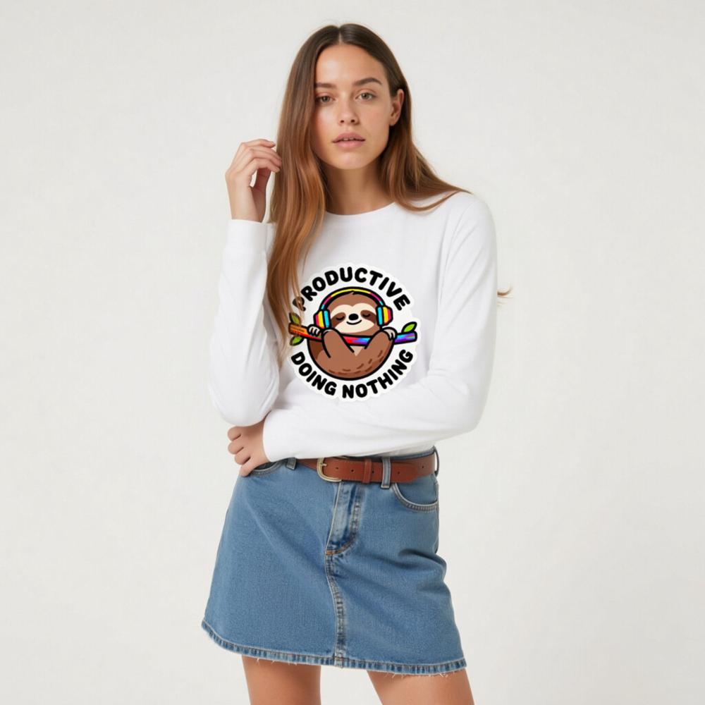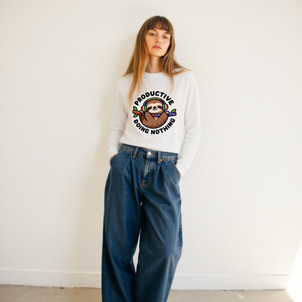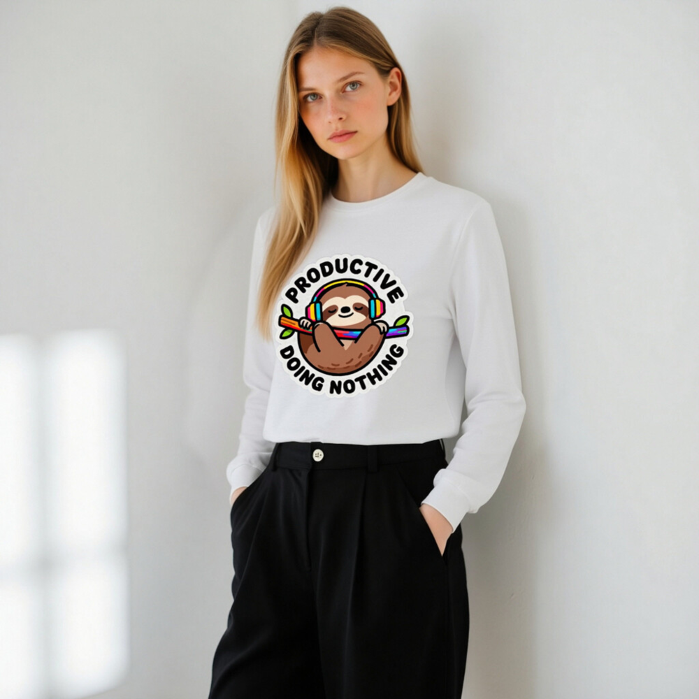This unisex long sleeve tee features a cute sloth wearing rainbow headphones, hugging a colorful branch—perfect for relaxed productivity lovers. The playful ‘Productive Doing Nothing’ circular design blends humor with comfort. Soft cotton blend, gender-neutral fit, ideal for casual wear or as a fun gift. Designed for everyday ease and joyful self-expression.