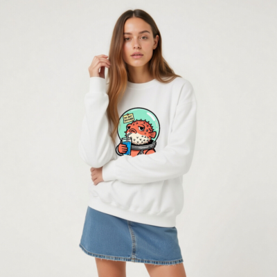 This unisex crew neck sweatshirt features a charming cartoon pufferfish in an astronaut suit, sipping blue drink with a ‘Do Not Disturb’ note on its helmet. Soft, comfortable, and stylish—perfect for space lovers and quirky fashion fans. Machine washable, made with quality cotton blend. Size range: S–XXL. Ideal gift for birthdays, holidays, or self-indulgence.