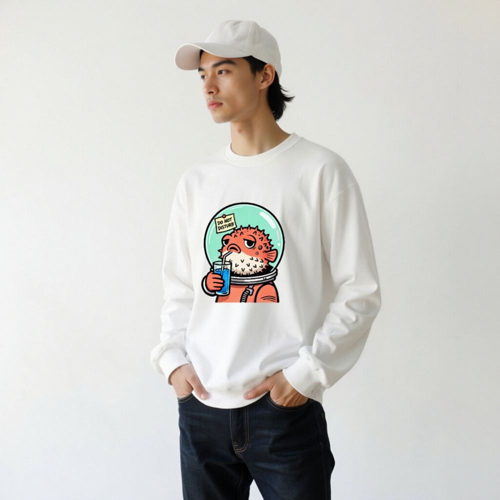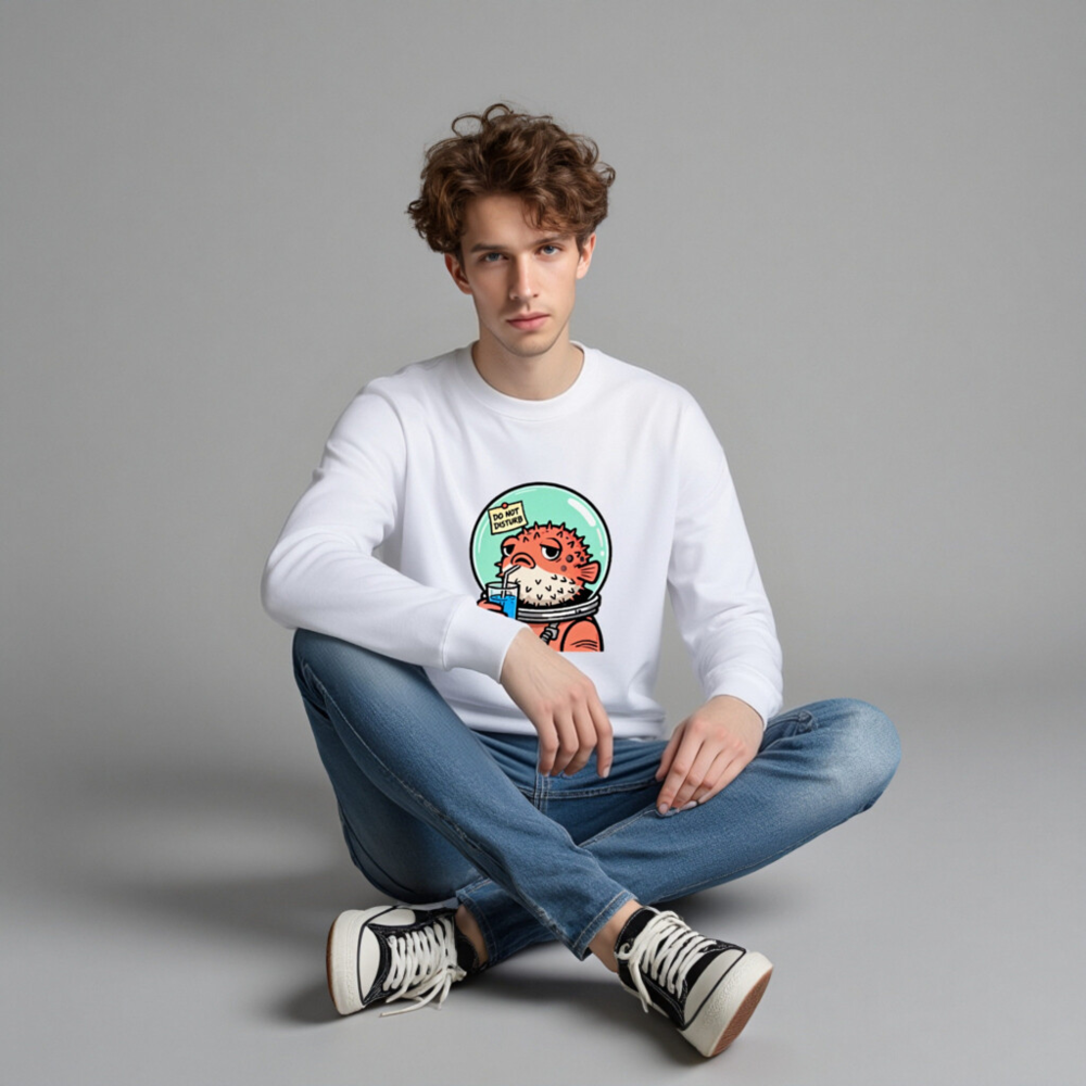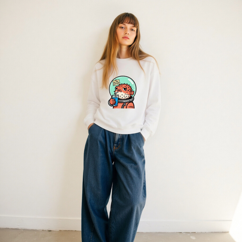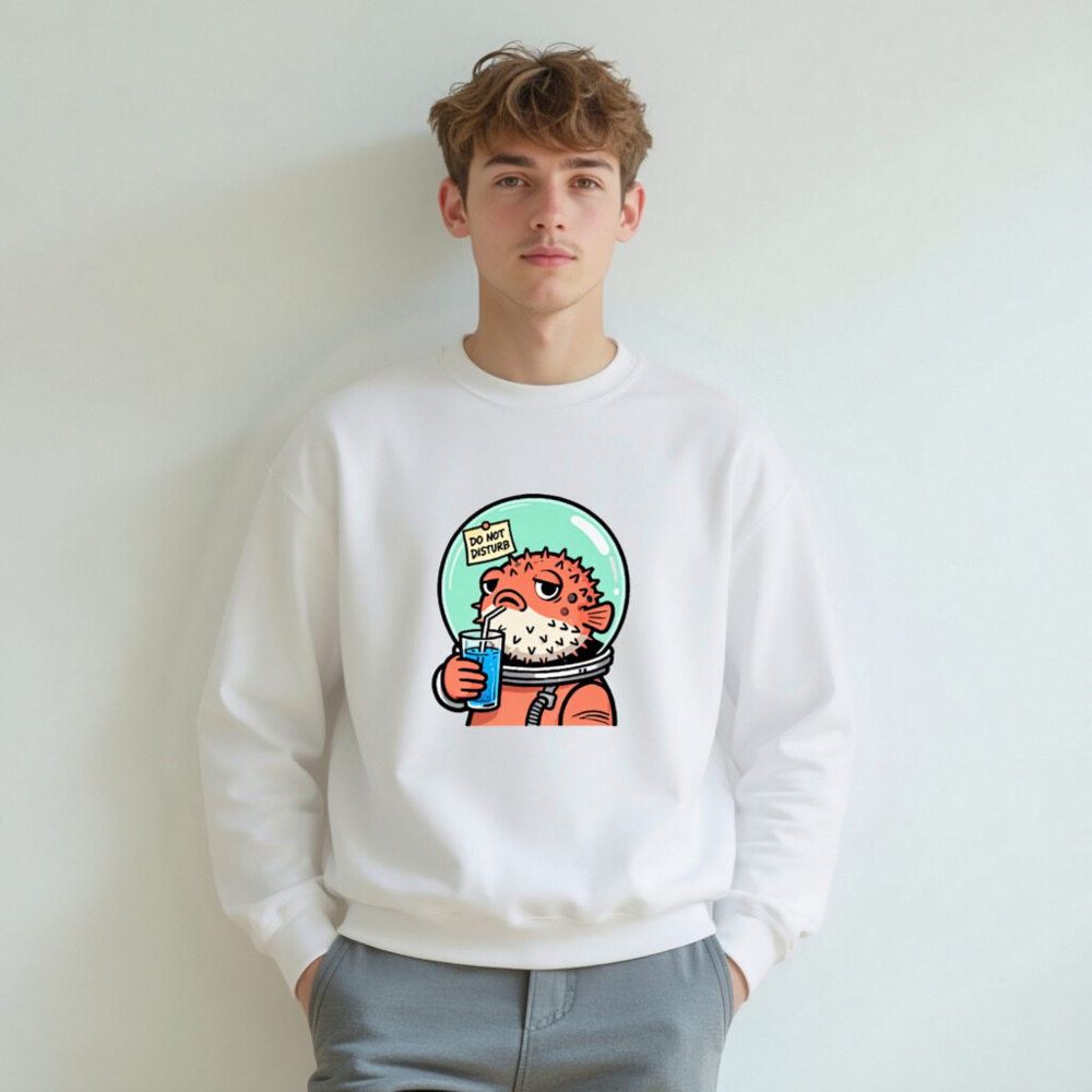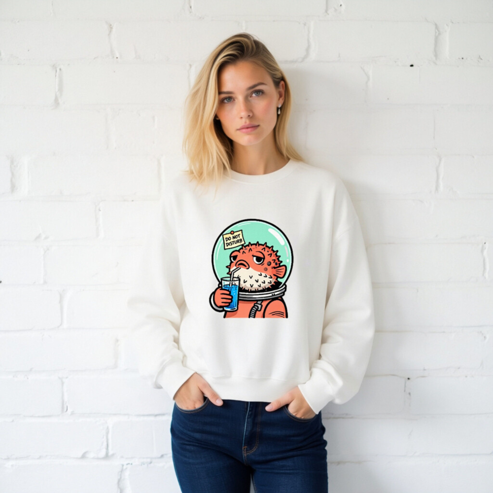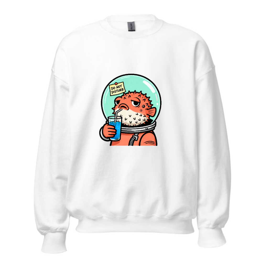 This unisex crew neck sweatshirt features a charming cartoon pufferfish in an astronaut suit, sipping blue drink with a ‘Do Not Disturb’ note on its helmet. Soft, comfortable, and stylish—perfect for space lovers and quirky fashion fans. Machine washable, made with quality cotton blend. Size range: S–XXL. Ideal gift for birthdays, holidays, or self-indulgence.