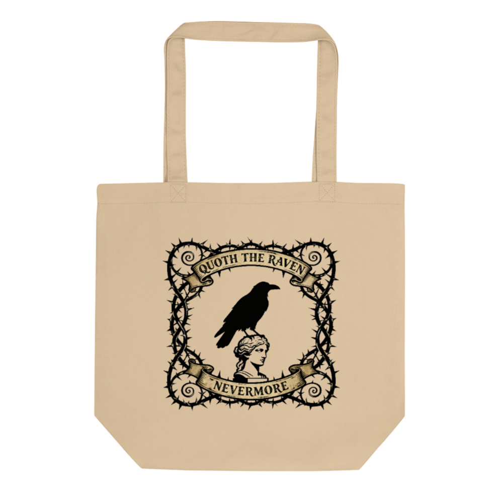 Eco-friendly oyster tote bag made from sustainable canvas, featuring a gothic-inspired design: a raven perched atop a classical bust, framed by thorny vines with the iconic phrase ‘Quoth the Raven Nevermore’. Lightweight, reusable, and ethically crafted for everyday use.