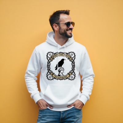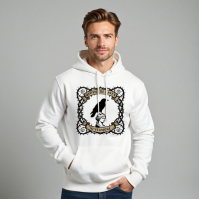 A premium unisex pullover hoodie featuring the iconic ‘Quoth the Raven Nevermore’ design: a black raven perched atop a classical bust, framed by thorny vines and vintage banners. Made for comfort and style, this high-quality hoodie is ideal for Poe fans and gothic fashion lovers. Soft cotton blend, classic fit, versatile for everyday wear.