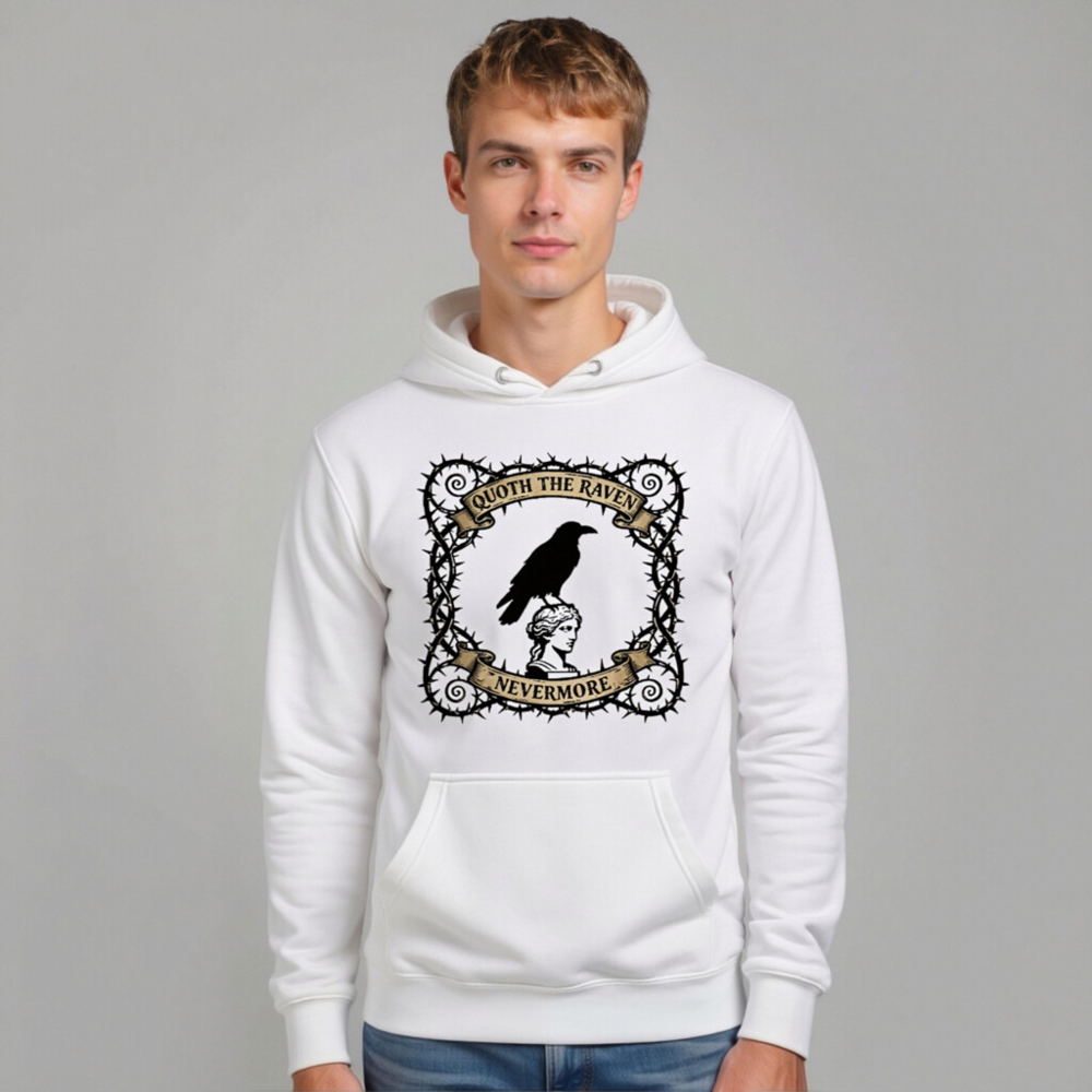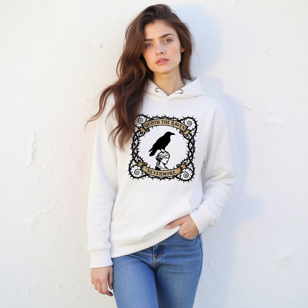 A premium unisex pullover hoodie featuring the iconic ‘Quoth the Raven Nevermore’ design: a black raven perched atop a classical bust, framed by thorny vines and vintage banners. Made for comfort and style, this high-quality hoodie is ideal for Poe fans and gothic fashion lovers. Soft cotton blend, classic fit, versatile for everyday wear.