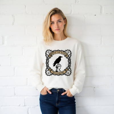 Unisex long sleeve tee featuring the iconic ‘Quoth the Raven Nevermore’ design: a black raven perched atop a classical bust, framed by thorny vines and vintage banners. Inspired by Poe’s famous poem, this gothic-style shirt blends literary homage with dark aesthetic appeal. Perfect for fans of classic literature, horror, or alternative fashion. Soft cotton blend, comfortable fit, versatile for everyday wear.